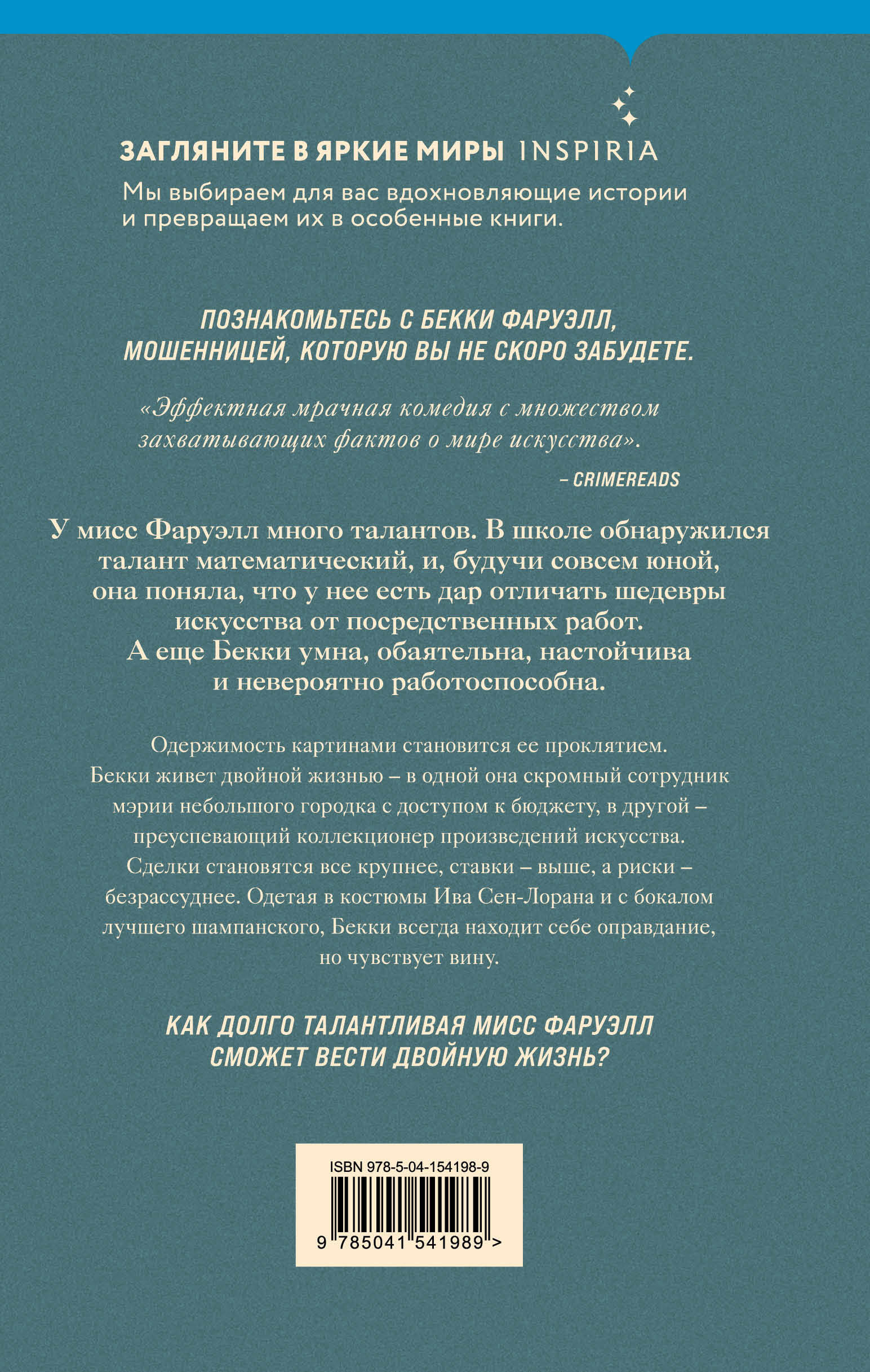 «Эффектная мрачная комедия с множеством захватывающих фактов о мире искусства». - CrimeReads Познакомьтесь с Бекки Фаруэлл, мошенницей, которую вы не скоро забудете. У мисс Фаруэлл много талантов. В школе обнаружился талант математический, и, будучи совсем юной, она поняла, что у нее есть дар отличать шедевры искусства от посредственных работ. А еще Бекки умна, обаятельна, настойчива и невероятно работоспособна. Одержимость картинами становится ее проклятием. Бекки живет двойной жизнью - в одной она скромный сотрудник мэрии небольшого городка с доступом к бюджету, в другой - преуспевающий коллекционер произведений искусства. Сделки становятся все крупнее, ставки - выше, а риски - безрассуднее. Одетая в костюмы Ив-Сен Лорана и с бокалом лучшего шампанского, Бекки всегда находит себе оправдание, но чувствует вину. Как долго талантливая мисс Фаруэлл сможет вести двойную жизнь?| Издательство | ООО "Издательство "Эксмо" |