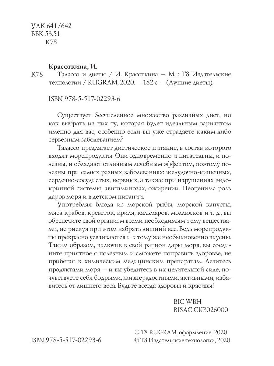 Существует бесчисленное множество различных диет, но как выбрать из них ту, которая будет идеальным вариантом именно для вас, особенно если вы уже страдаете каким-либо серьезным заболеванием? Талассо предлагает диетическое питание, в состав которого входят морепродукты. Они одновременно и питательны, и полезны, и обладают отличным лечебным эффектом, поэтому полезны при самых разных заболеваниях: желудочно-кишечных, сердечно-сосудистых, нервных, а также при нарушениях эндокринной системы, авитаминозах, ожирении. Неоценима роль даров моря и в детском питании. Употребляя блюда из морской рыбы, морской капусты, мяса крабов, креветок, криля, кальмаров, моллюсков и т. д., вы обеспечите свой организм всеми необходимыми ему веществами, не рискуя при этом набрать лишний вес. Ведь морепродукты прекрасно усваиваются и к тому же необыкновенно вкусны. Таким образом, включив в свой рацион дары моря, вы соедините приятное с полезным и сможете поправить здоровье, не прибегая к химическим медицинским препаратам. Лечитесь продуктами моря - и вы убедитесь в их целительной силе, почувствуете себя бодрыми, жизнерадостными, активными, избавитесь от лишнего веса. Будьте всегда здоровы и красивы!| Издательство | Т8 RUGRAM |