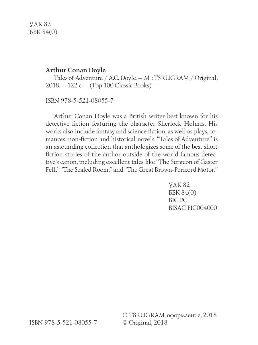 Arthur Conan Doyle was a British writer best known for his detective fiction featuring the character Sherlock Holmes. His works also include fantasy and science fiction, as well as plays, romances, non-fiction and historical novels. "Tales of Adventure" is an astounding collection that anthologizes some of the best short fiction stories of the author outside of the world-famous detective's canon, including excellent tales like "The Surgeon of Gaster Fell," "The Sealed Room," and "The Great Brown-Pericord Motor."| Издательство | Т8 RUGRAM |
