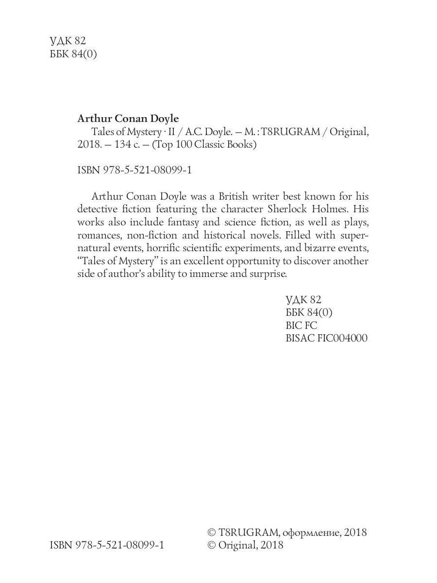 Arthur Conan Doyle was a British writer best known for his detective fiction featuring the character Sherlock Holmes. His works also include fantasy and science fiction, as well as plays, romances, non-fiction and historical novels. Filled with supernatural events, horrific scientific experiments, and bizarre events, "Tales of Mystery" is an excellent opportunity to discover another side of author's ability to immerse and surprise.| Издательство | Т8 RUGRAM |