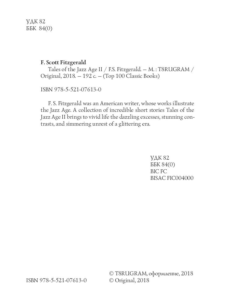 F.S. Fitzgerald was an American writer, whose works illustrate the Jazz Age. A collection of incredible short stories Tales of the Jazz Age II brings to vivid life the dazzling excesses, stunning contrasts, and simmering unrest of a glittering era.| Издательство | Т8 RUGRAM |