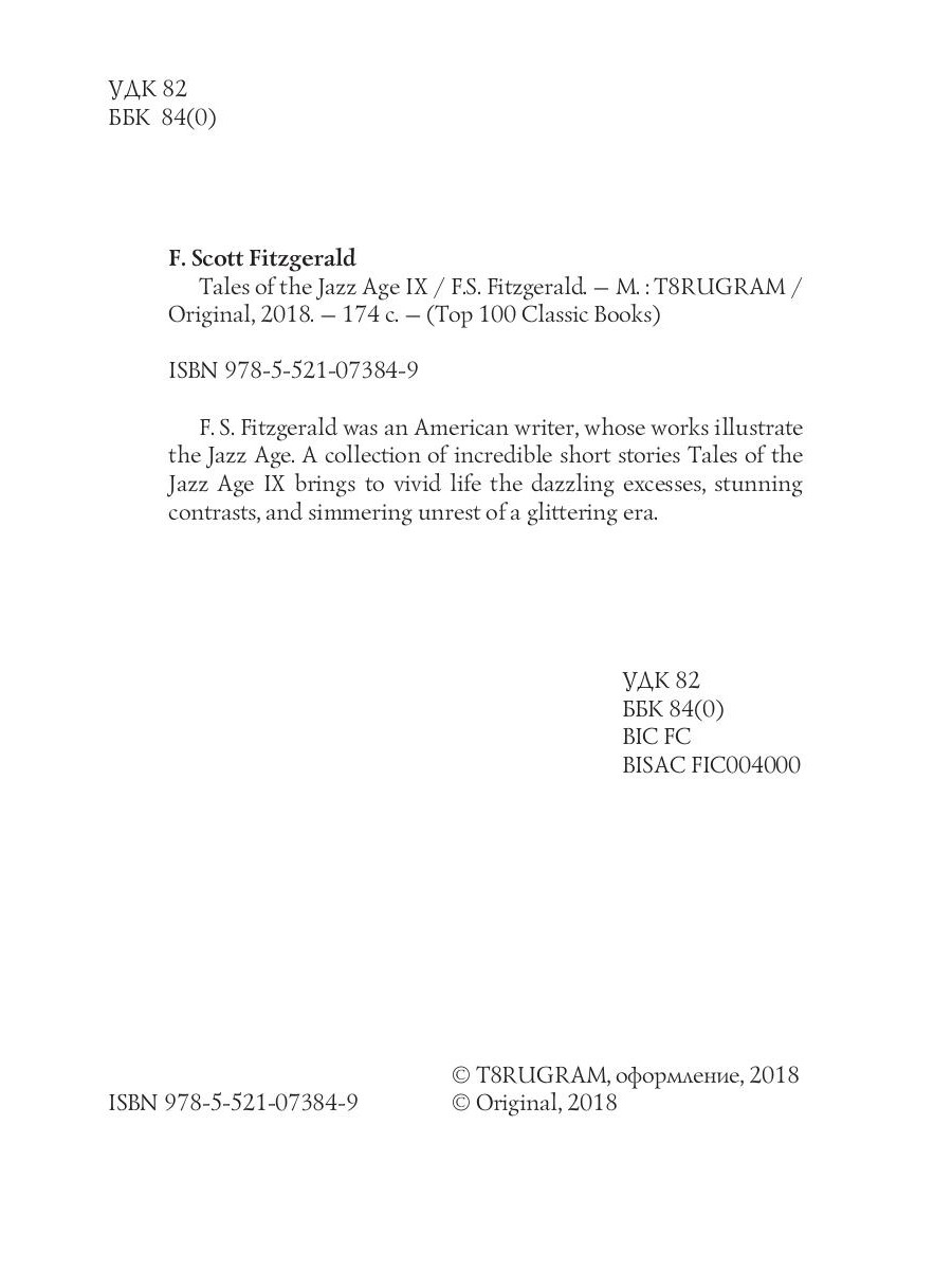F. S. Fitzgerald was an American writer, whose works illustrate the Jazz Age. A collection of incredible short stories Tales of the Jazz Age IX brings to vivid life the dazzling excesses, stunning contrasts, and simmering unrest of a glittering era.| Издательство | Т8 RUGRAM |
