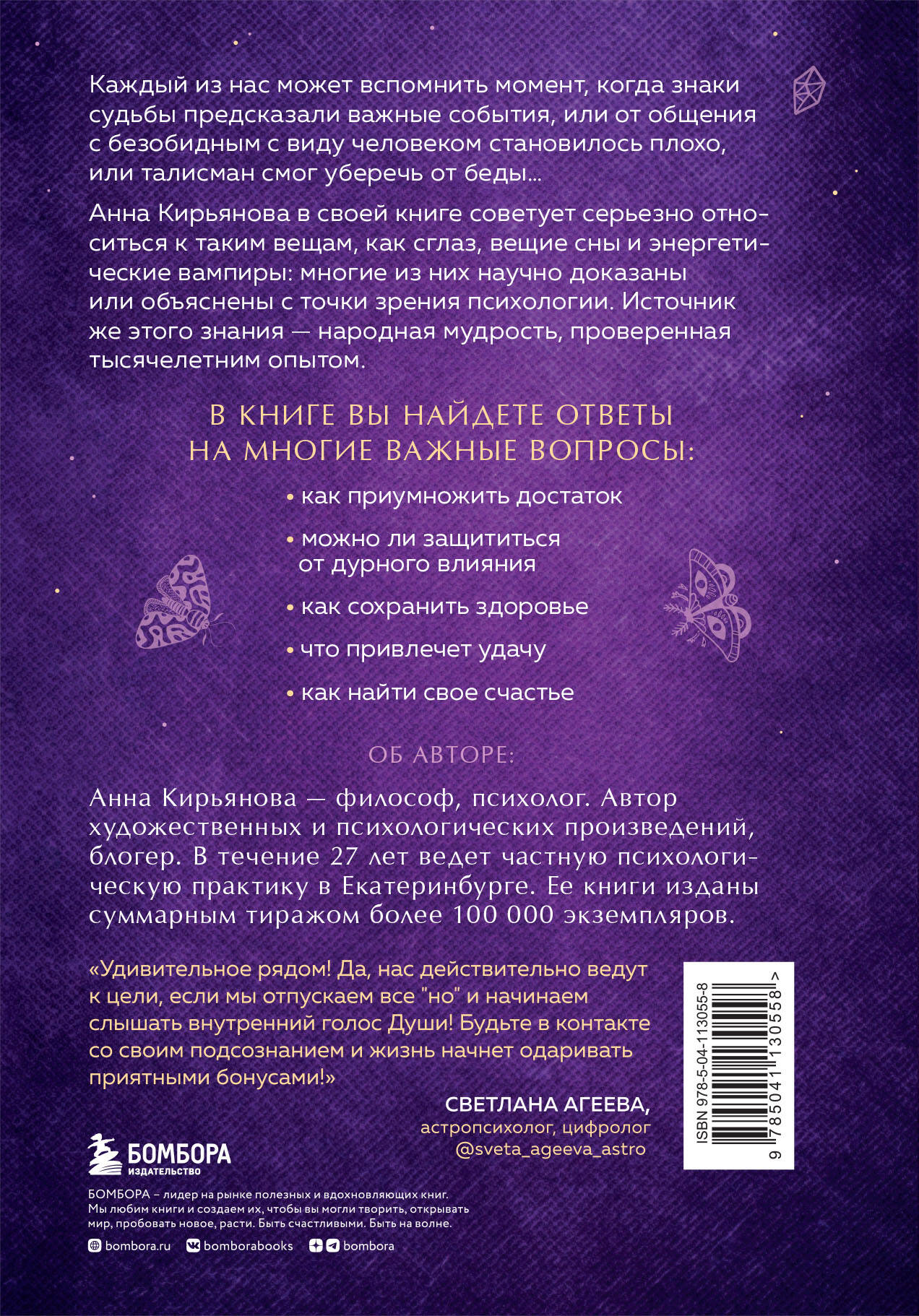 Каждый из нас может вспомнить момент, когда знаки судьбы предсказали важные события, или от общения с безобидным с виду человеком становилось плохо, или талисман смог уберечь от беды… Анна Кирьянова в своей книге советует серьезно относиться к таким вещам, как сглаз, вещие сны и энергетические вампиры: многие из них научно доказаны или объяснены с точки зрения психологии. Источник же этого знания - народная мудрость, проверенная тысячелетним опытом. В книге вы найдете ответы на многие важные вопросы: • как приумножить достаток; • можно ли защититься от дурного влияния; • как сохранить здоровье; • что привлечет удачу; • как найти свое счастье. Об авторе Анна Кирьянова - философ, психолог. Автор художественных и психологических произведений, блогер. В течение 27 лет ведет частную психологическую практику в Екатеринбурге. Ее книги изданы суммарным тиражом более 100 000 экземпляров.| Издательство | ООО "Издательство "Эксмо" |