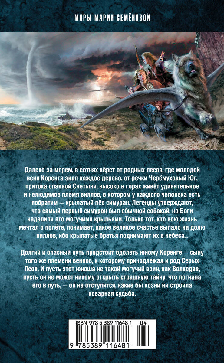 Далеко за морем, в сотнях вёрст от родных лесов, где молодой венн Коренгa знал каждое дерево, от речки Черёмуховый Юг, притока славной Светыни, высоко в горах живёт удивительное и нелюдимое племя виллов, в котором у каждого человека есть побратим - крылатый пес симуран. Легенды утверждают, что самый первый симуран был обычной собакой, но Боги наделили его могучими крыльями. Только тот, кто всю жизнь мечтал о полете, понимает, какое великое счастье выпало на долю виллов, ибо крылатые братья поднимают их в небеса. Долгий и опасный путь предстоит одолеть юному Коренге - сыну того же племени веннов, к которому принадлежал и род Серых Псов. И пусть этот юноша не такой могучий воин, как Волкодав, пусть он не может никому открыть страшную тайну, что погнала его в путь, - он не отступится, какие бы козни ни строила коварная судьба.| Издательство | Азбука-Аттикус Издат.группа ООО |