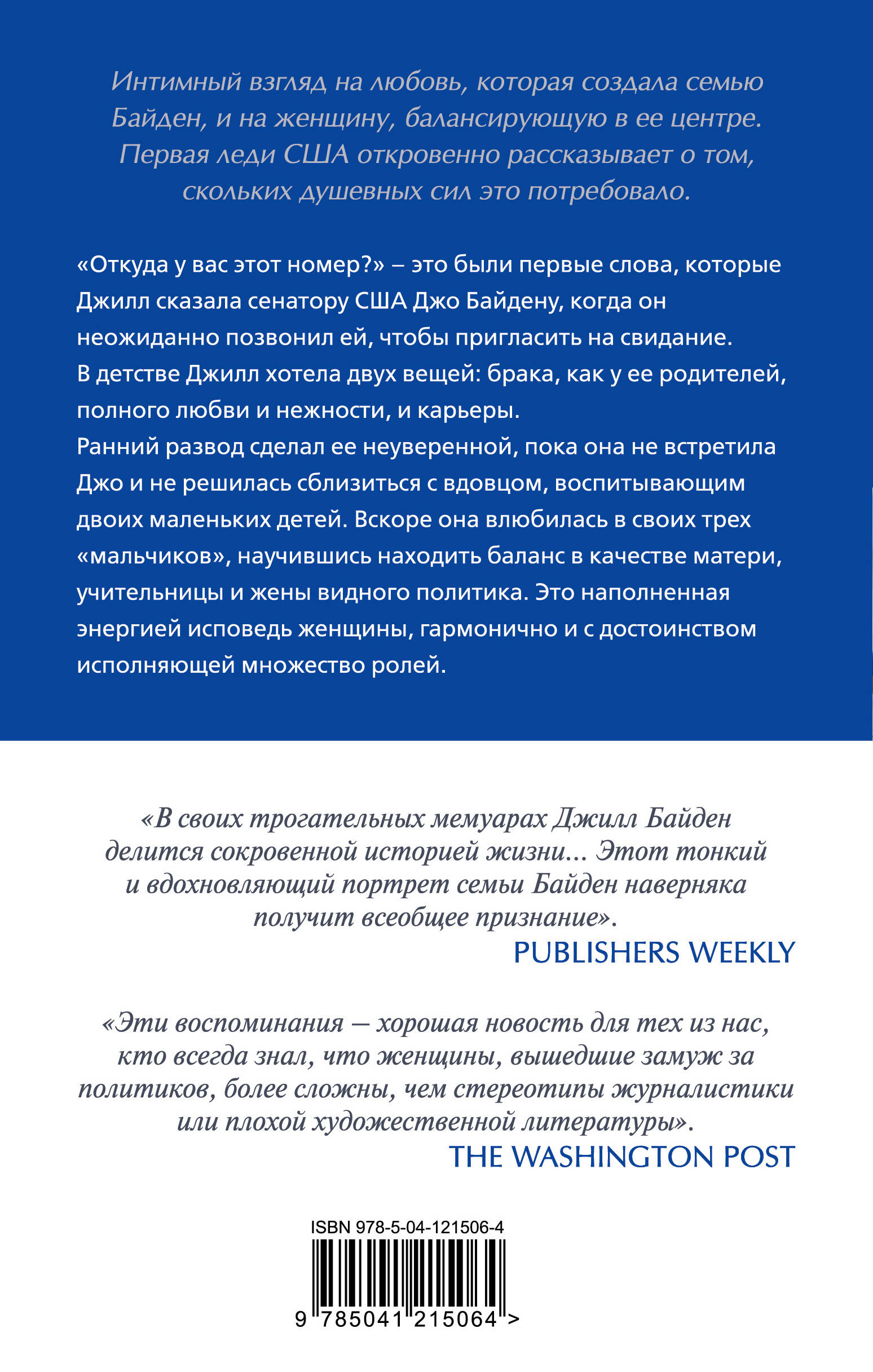 NEW YORK TIMES BESTSELLER. Интимный взгляд на любовь, которая создала семью Байденов, и на хрупкую женщину, балансирующую в ее центре. Первая леди США откровенно рассказывает о том, скольких душевных сил это потребовало. «Откуда у вас этот номер?» Это были первые слова, которые Джилл Байден сказала сенатору США Джо Байдену, когда он неожиданно позвонил ей, чтобы пригласить ее на свидание. В детстве Джилл хотела двух вещей: брака, как у ее родителей, полного любви и нежности, и карьеры. Ранний развод сделал ее неуверенной, пока она не встретила Джо и не решилась сблизиться с вдовцом с двумя маленькими детьми и политиком. Вскоре она влюбилась в своих трех «мальчиков», научившись находить баланс в качестве матери, жены, учительницы и супруги сенатора, а затем и вице-президента. Это наполненная энергией исповедь женщины, гармонично и с достоинством исполняющей множество ролей. «В своих трогательных мемуарах Джилл Байден делится сокровенной историей жизни... Этот тонкий и вдохновляющий портрет семьи Байденов наверняка получит всеобщее признание». - PUBLISHERS WEEKLY «Эти воспоминания - хорошая новость для тех из нас, кто всегда знал, что женщины, вышедшие замуж за политиков, более сложны, чем стереотипы журналистики или плохой художественной литературы». - THE WASHINGTON POST| Издательство | ООО "Издательство "Эксмо" |