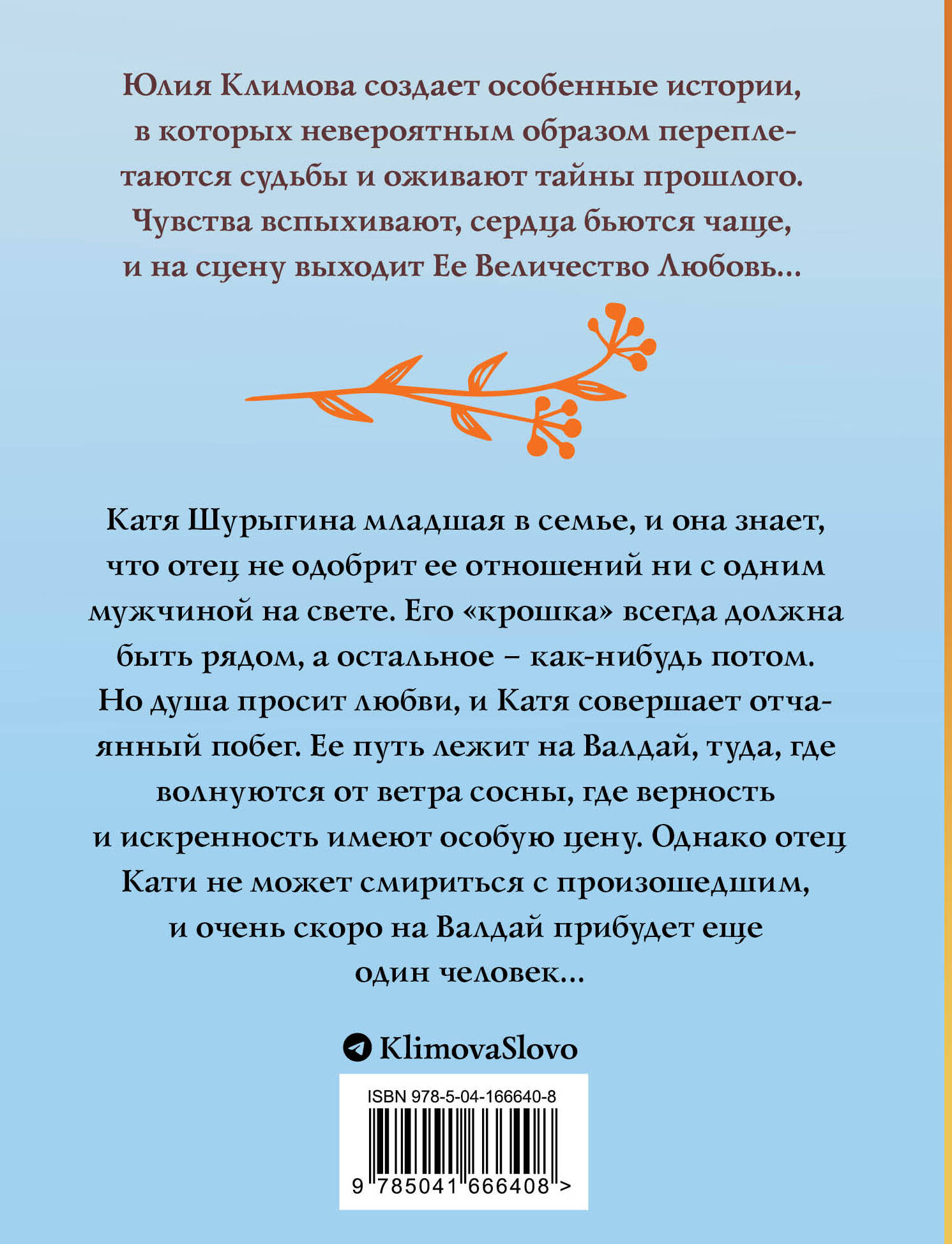 Истории Юлии Климовой - самые уютные и добрые романы о любви. Катя Шурыгина младшая в семье, и она знает, что отец не одобрит ее отношений ни с одним мужчиной на свете. Его «крошка» всегда должна быть рядом, а остальное - как-нибудь потом. Но душа просит любви, и Катя совершает отчаянный побег. Ее путь лежит на Валдай, туда, где волнуются от ветра сосны, где верность и искренность имеют особую цену. Однако отец Кати не может смириться с произошедшим, и очень скоро на Валдай прибудет еще один человек…| Издательство | Эксмо |