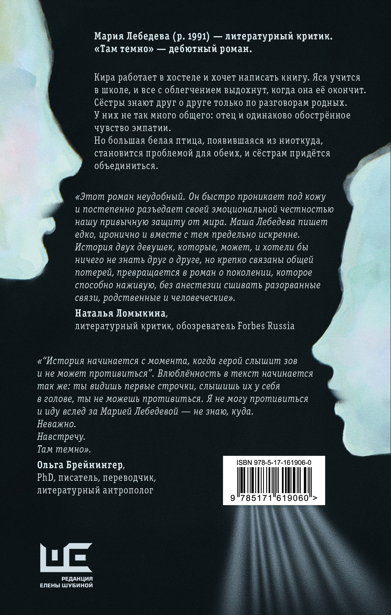 Необычный дебютный роман. Достоверная, метафоричная и притчево воодушевляющая история. История о двух сестрах, крепко связанных общей потерей. Их не связывает ничего, кроме общего отца. Но наступает момент, когда они оказываются нужны друг другу сильнее, чем хотелось бы обеим. Видеть свет в других и себе. Главные герои романа «Там темно» только учатся этому. Но у них все получится.| Издательство | Издательство "АСТ" |