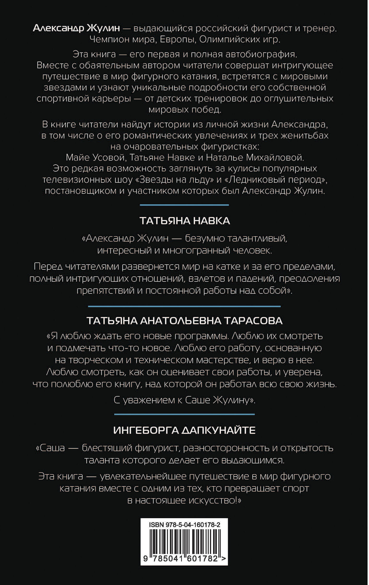 Александр Жулин - чемпион мира, Европы и СССР, олимпийский призер в парных танцах на льду, любимец публики, обаятельный и сильный. Он реализовал себя как спортсмен, тренер, ключевой участник и постановщик прекрасных выступлений на рвущих рейтинги телевизионных шоу. Знаменитый фигурист впервые приглашает читателей в увлекательнейшее путешествие в мир фигурного катания и в свою полную драматических поворотов жизнь. Александр Жулин с юмором и теплотой делится драматическими и даже трагическими историями. О спорте - от первых детских шагов до оглушительных мировых успехов на чемпионатах и олимпиадах. О своих трех женитьбах на очаровательных фигуристках: Майе Усовой, Татьяне Навке и Наталье Михайловой. О дорогих близких, друзьях, коллегах, тренерах. О постановке популярных телевизионных шоу «Звезды на льду» и «Ледниковый период». Из этих живых рассказов рождается портрет неординарного, энергичного и творческого человека, который умеет восхищать миллионы людей своим искусством и своими достижениями. «Александр Жулин - безумно талантливый, интересный и многогранный человек. Перед читателями развернется мир на катке и за его пределами, полный интригующих отношений, взлетов и падений, преодоления препятствий и постоянной работы над собой». - ТАТЬЯНА НАВКА «Я люблю ждать его новые программы. Люблю их смотреть и подмечать что-то новое. Люблю его работу, основанную на творческом и техническом мастерстве, и верю в нее. Люблю смотреть, как он оценивает свои работы, и уверена, что полюблю его книгу, над которой он работал всю свою жизнь. С уважением к Саше Жулину». - ТАТЬЯНА АНАТОЛЬЕВНА ТАРАСОВА «Саша - блестящий фигурист, разносторонность и открытость таланта которого делает его выдающимся. Эта книга - увлекательнейшее путешествие в мир фигурного катания вместе с одним из тех, кто превращает спорт в настоящее искусство!» - ИНГЕБОРГА ДАПКУНАЙТЕ «Каждый раз, когда Саша давал мне прочитать написанное, я успевала порыдать, размазав тушь по лицу, и, пару мгновений спустя, напугать всех домашних своим хохотом. Смена эмоций случалась на протяжении чтения буквально одного абзаца. Все, кто близко знает Сашу, поймут, о чем я говорю. Любой рассказ он умеет дополнить такими деталями, что хоть стой, хоть падай (лучше сразу падай ). Что-что, а чувство юмора - это его конек. Шутя, он покорил в свое время мое сердце, и я до сих пор не могу прийти в себя от смеха». - НАТАЛЬЯ ЖУЛИНА