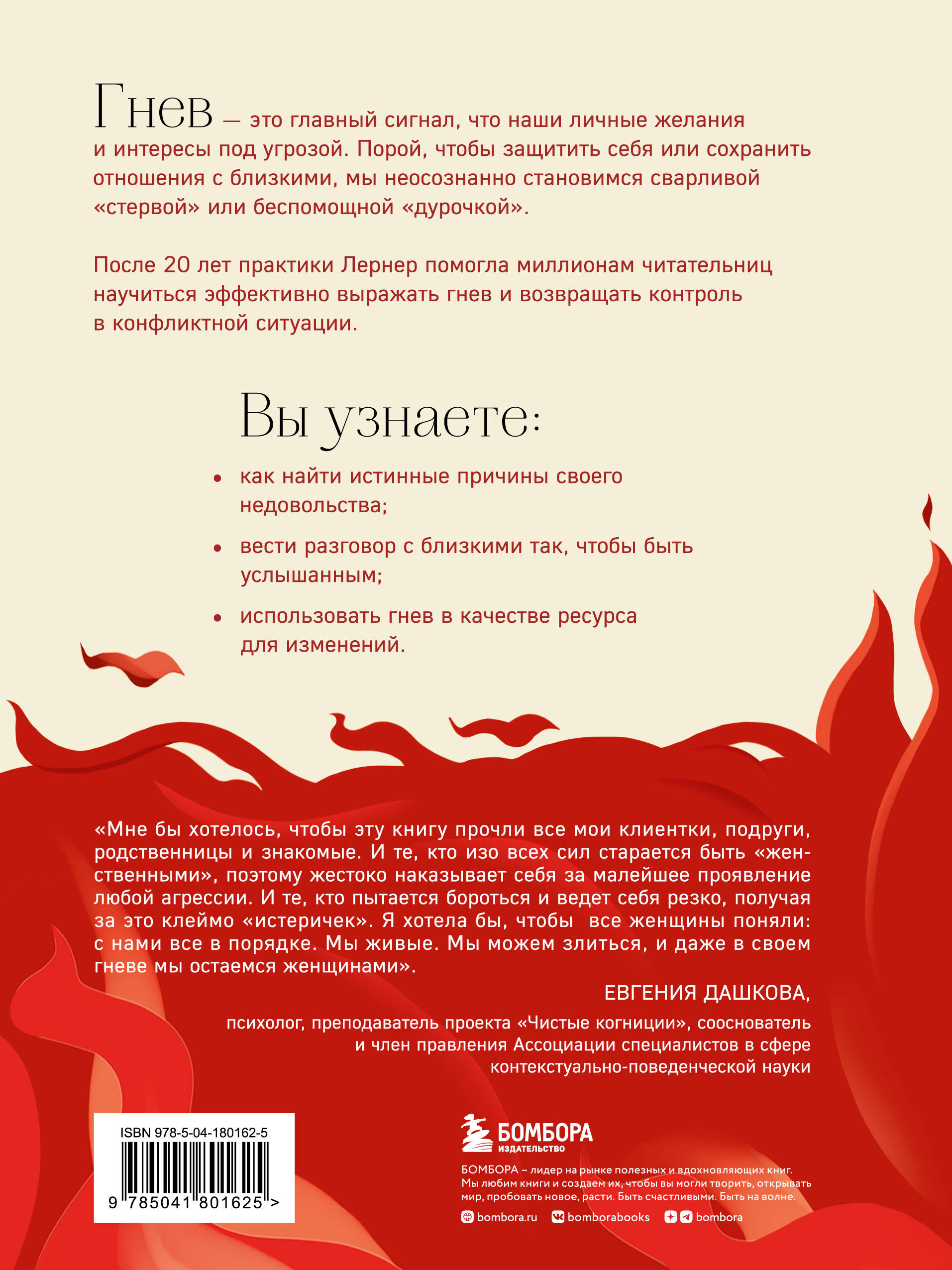 Гнев - это главный сигнал, сигнал что наши личные желания и интересы под угрозой. Порой, чтобы защитить себя или сохранить отношения с близкими, мы неосознанно становимся сварливой «стервой» или беспомощной «дурочкой». После двадцати лет практики Лернер помогла миллионам читательниц научиться эффективно выражать гнев и вернуть контроль в конфликтной ситуации. Вы узнаете: - как найти истинные причины своего недовольства; - вести разговор с близкими так, чтобы быть услышанным; - использовать гнев в качестве ресурса для изменений. «Мне бы хотелось, чтобы эту книгу прочли все мои клиентки, подруги, родственницы и знакомые. И те, кто изо всех сил старается быть "женственными", поэтому жестоко наказывают себя за малейшее проявление любой агрессии. И те, кто пытается бороться и ведут себя резко, получая за это клеймо "истеричек". Я хотела бы, чтобы все женщины поняли: с нами все в порядке. Мы живые. Мы можем злиться и даже в своем гневе мы остаемся женщинами». - Евгения Дашкова, психолог, преподаватель проекта «Чистые когниции», сооснователь и член правления Ассоциации специалистов в сфере контекстуально-поведенческой науки