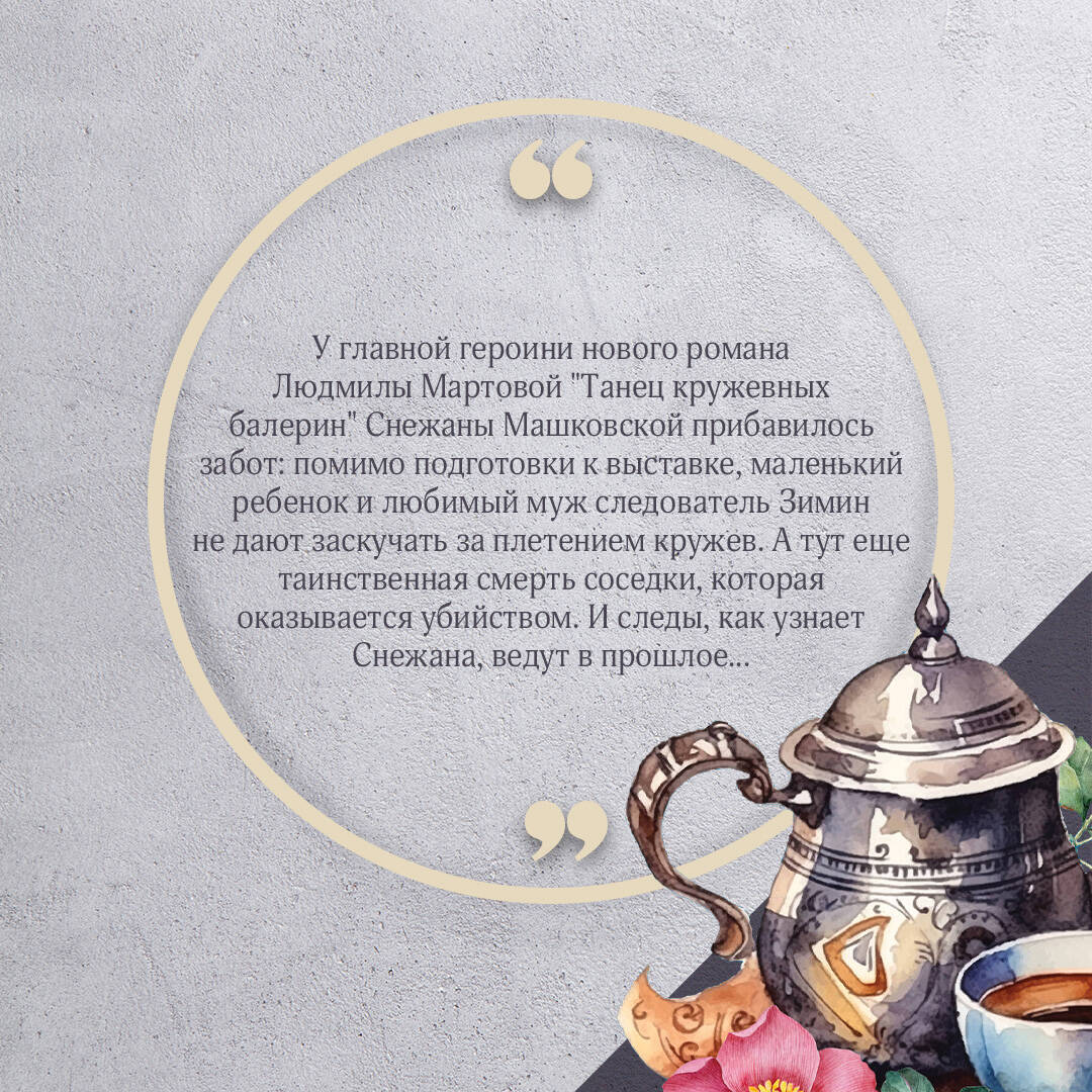 У главной героини нового романа Людмилы Мартовой «Танец кружевных балерин» Снежаны Машковской прибавилось забот: помимо подготовки к выставке, маленький ребенок и любимый муж следователь Зимин не дают заскучать за плетением кружев. А тут еще таинственная смерть соседки, которая оказывается убийством. И следы, как узнает Снежана, ведут в прошлое... Людмила Мартова родилась, выросла и всю жизнь живет в Вологде, поэтому действие ее романов обычно разворачивается в российской глубинке. Ее героини - женщины, волею обстоятельств вынужденные становиться сильными и решительными. Они находят выход из любой самой сложной ситуации и, конечно, как и все, мечтают о счастье.| Издательство | ООО "Издательство "Эксмо" |