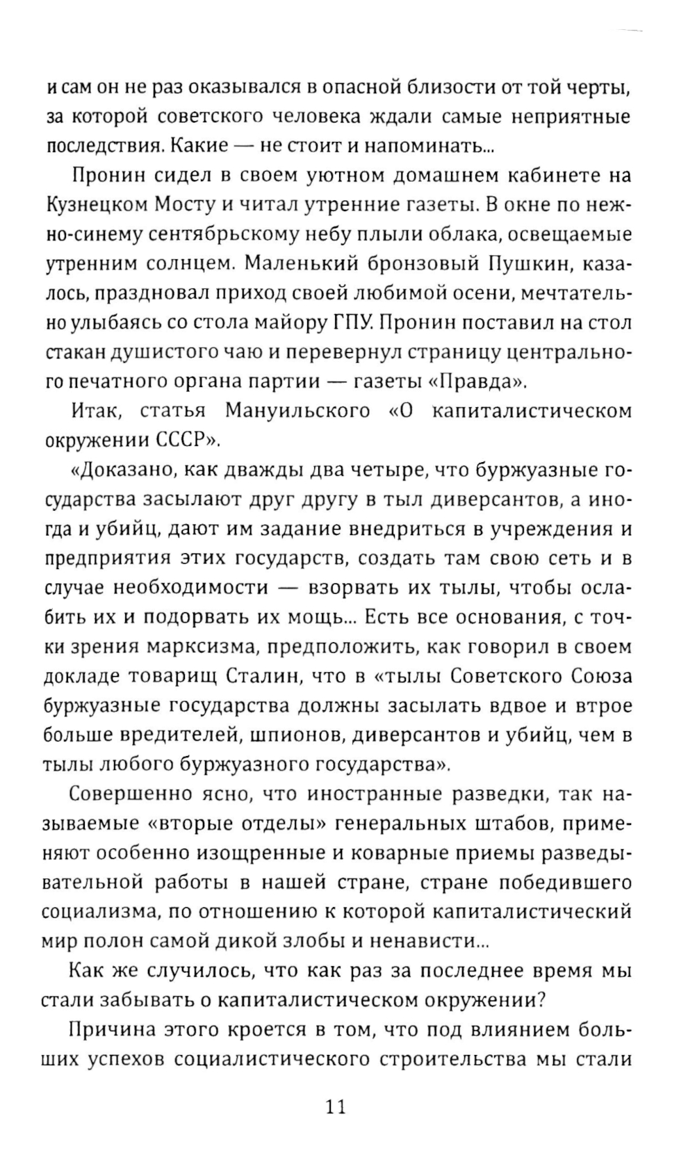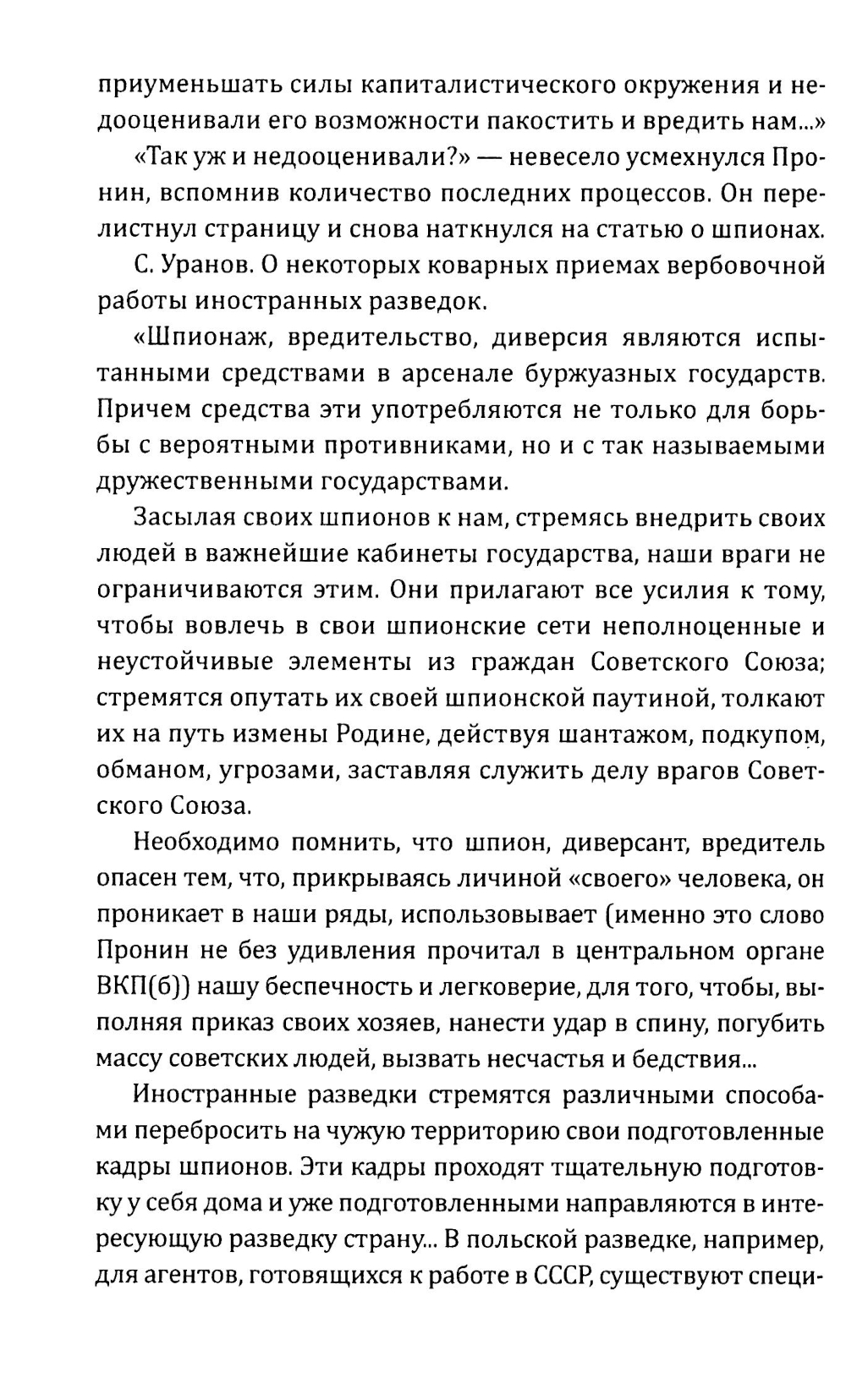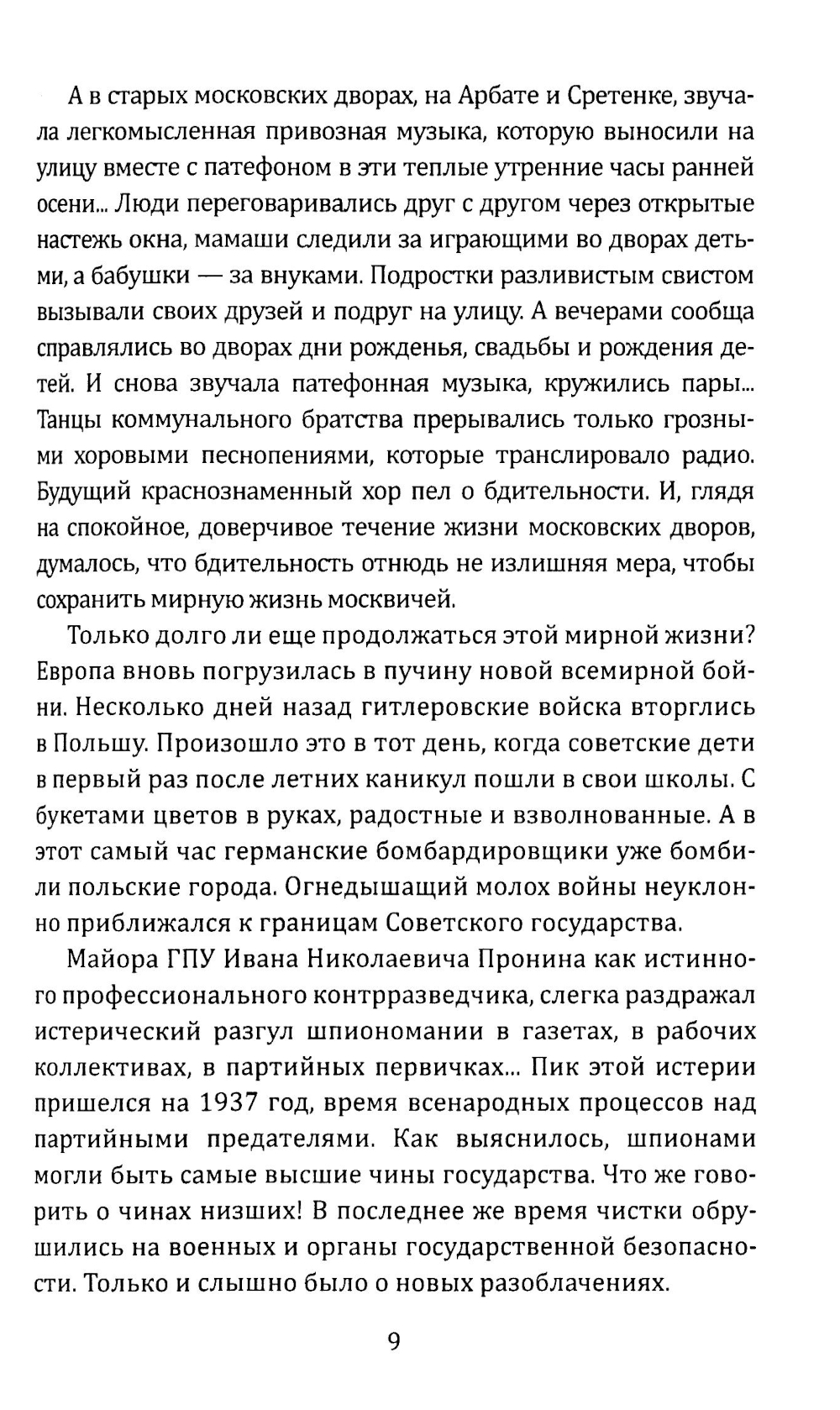 Сентябрь 1940 года. Германия уже вторглась в Польшу, но мир еще не знает, что Вторая мировая война уже началась. Советское государство, едва окрепшее после революционной разрухи и Гражданской войны, строит новую жизнь. Но врагов хватает. В гнетущей обстановке шпиономании продолжает честно выполнять свою работу майор ГПУ Иван Николаевич Пронин. Вместе со своим незаменимым помощником, Виктором Железновым, легендарный контрразведчик расследует дело о пропаже документа государственной важности, снова встречается со своим давним неуловимым врагом - английским шпионом Роджерсом, за несколько дней разоблачает предателя Родины и... не танцует аргентинское танго...| Издательство | Родина |