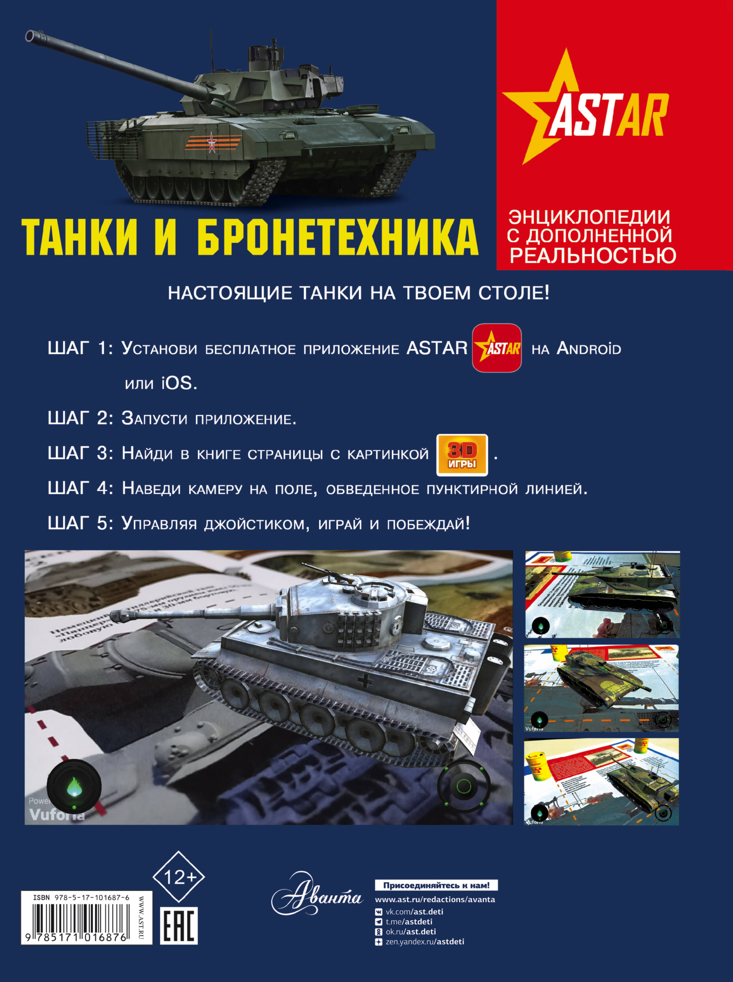 Перед вами не обычная энциклопедия: это - книга с дополненной реальностью в формате интерактивных 3D-игр. Это означает, что у вас появилась уникальная возможность не только познакомиться с танками и другими видами бронетехники, читая их описание, но и увидеть эти боевые машины в движении и объеме и даже научиться ими управлять, участвуя в захватывающих сражениях. Как же это возможно? Всё просто: возьмите смартфон или планшет, загрузите бесплатное мобильное приложение, установите его, наведите устройство на страницу из книги с таким значком (3D-игры) - и перед вами откроются небывалые возможности дополненной реальности! По вашему желанию танки и другая бронетехника будут ездить, стрелять, тонуть, гореть, взрываться - и всем этим будете управлять вы сами!| Издательство | ИЗДАТЕЛЬСТВО "АСТ" |