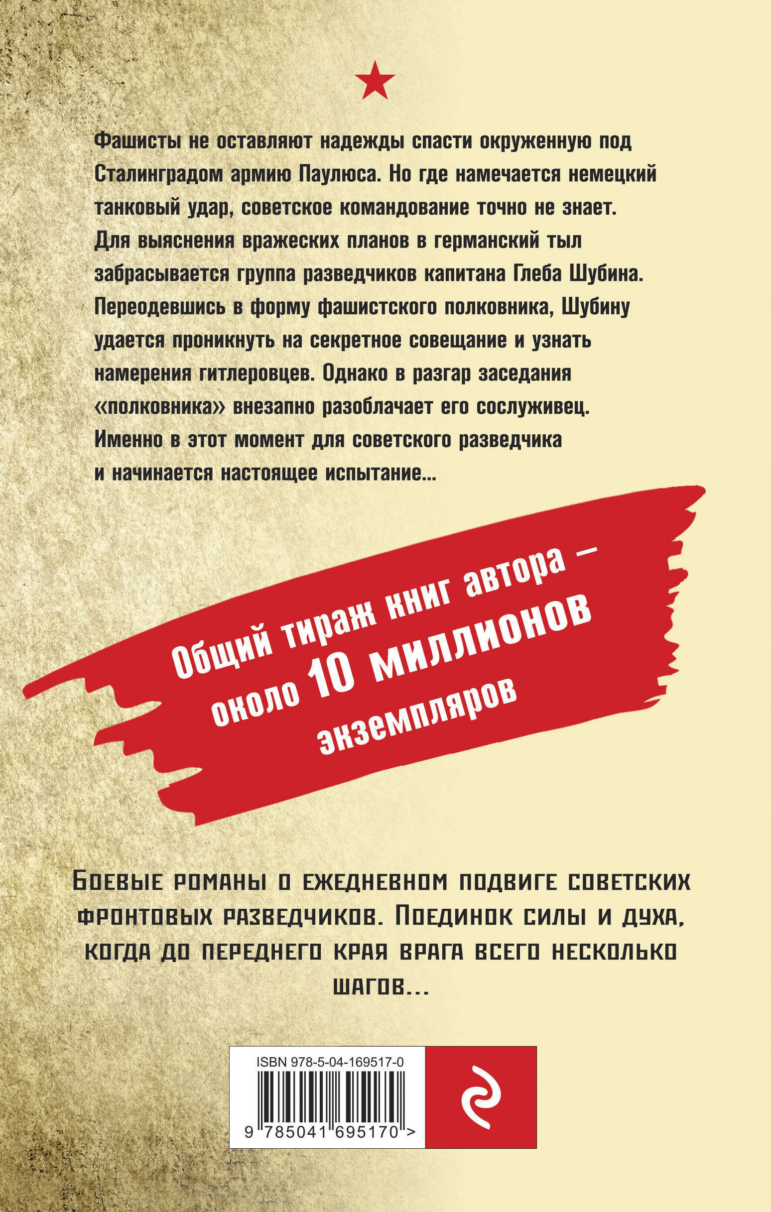 Боевые романы о ежедневном подвиге советских фронтовых разведчиков. Поединок силы и духа, когда до переднего края врага всего несколько шагов. Подробности жестоких боев, о которых не рассказывают даже ветераны - участники тех событий. Фашисты не оставляют надежды спасти окруженную под Сталинградом армию Паулюса. Но где намечается немецкий танковый удар, советское командование точно не знает. Для выяснения вражеских планов в германский тыл забрасывается группа разведчиков капитана Глеба Шубина. Переодевшись в форму фашистского полковника, Шубину удается проникнуть на секретное совещание и узнать намерения гитлеровцев. Однако в разгар заседания «полковника» внезапно разоблачает его сослуживец. Именно в этот момент для советского разведчика и начинается настоящее испытание… Общий тираж книг автора - более 10 миллионов экземпляров.| Издательство | ООО "Издательство "Эксмо" |