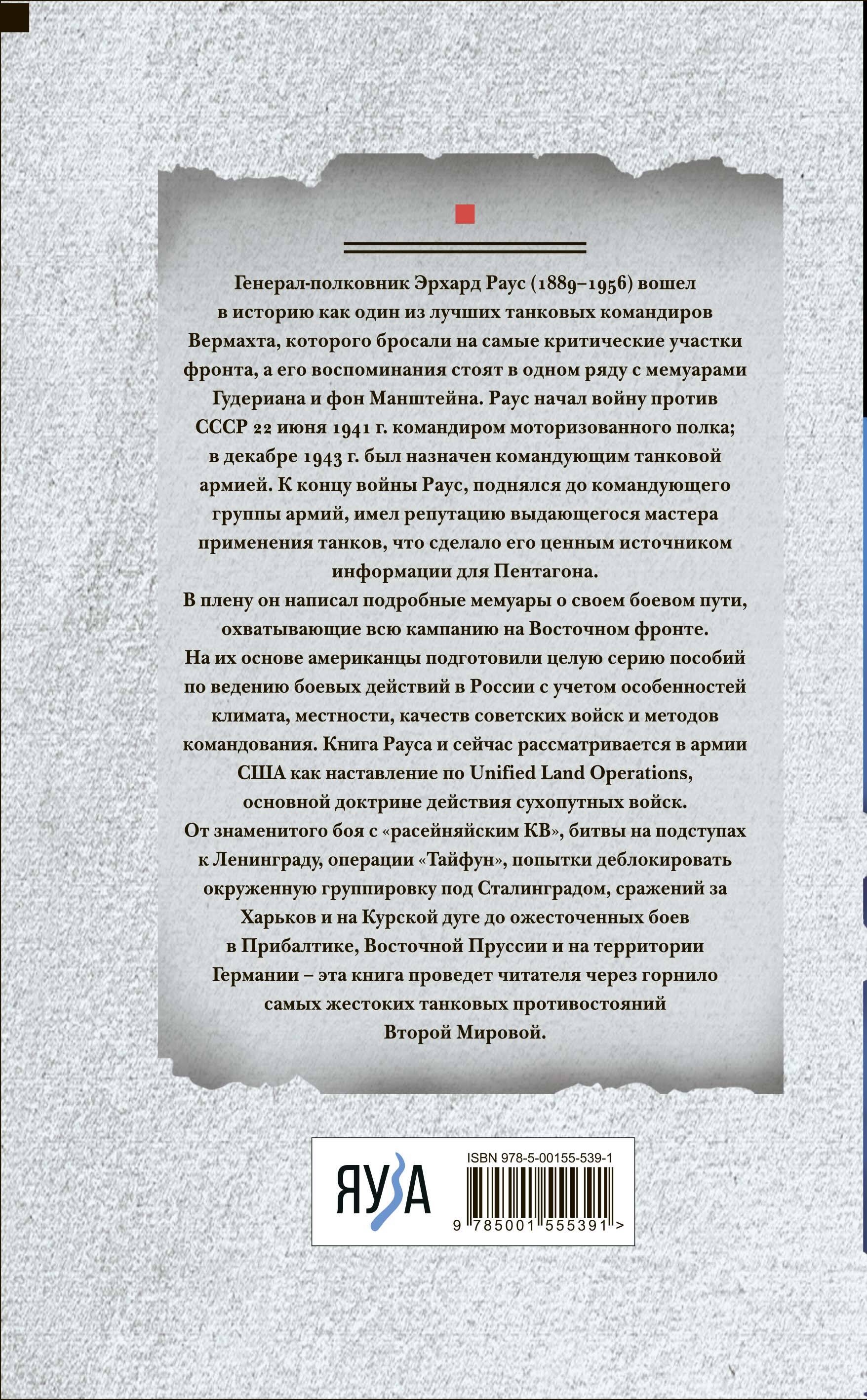Генерал-полковник Эрхард Раус (1889-1956) вошел в историю как один из лучших танковых командиров Вермахта, которого бросали на самые критические участки фронта, а его воспоминания стоят в одном ряду с мемуарами Гудериана и фон Манштейна. Раус начал войну против СССР 22 июня 1941 г. командиром моторизованного полка; в декабре 1943 г. был назначен командующим танковой армией. К концу войны Раус, поднявшийся до командующего группы армией, имел репутацию выдающегося мастера применения танков, что сделало его ценным источником информации для Пентагона. В плену он написал подробные мемуары о своем боевом пути, охватывающие всю кампанию на Восточном фронте. На их основе американцы подготовили целую серию пособий по ведению боевых действий в России с учетом особенностей климата, местности, качеств советских войск и методов командования. Книга Рауса и сейчас рассматривается в армии США как наставление по Unified Land Operations, основной доктрине действия сухопутных войск. От знаменитого боя с "расейняйским КВ", битвы на подступах к Ленинграду, операции "Тайфун", попытки деблокировать окруженную группировку под Сталинградом, сражений за Харьков и на Курской дуге до ожесточенных боев в Прибалтике, Восточной Пруссии и на территории Германии - эта книга проведет читателя через горнило самых жестоких танковых противостояний Второй мировой.| Издательство | Яуза-каталог ООО |