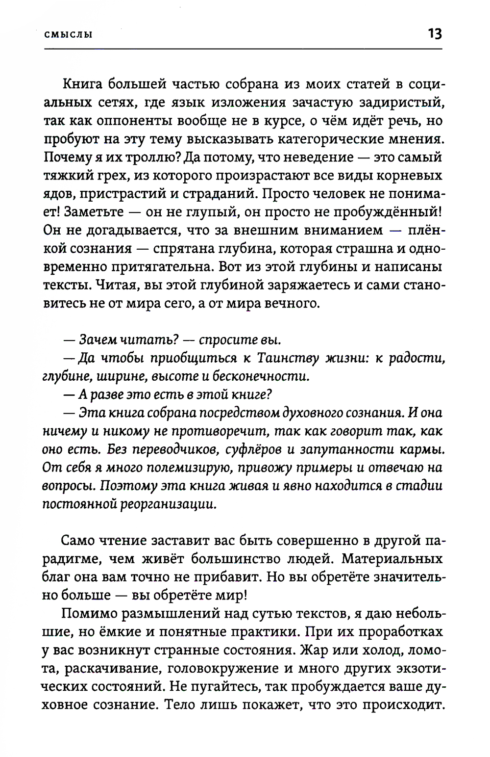 Эта книга собрана посредством духовного сознания. И она ничему и никому не противоречит, так как говорит так, как оно есть. Без переводчиков, суфлёров и запутанности кармы. От себя я много полемизирую, привожу примеры и отвечаю на вопросы. Поэтому эта книга живая и явно находится в стадии постоянной реорганизации. Само чтение заставит вас быть совершенно в иной парадигме, чем живёт большинство людей. Материальных благ она вам точно не прибавит. Но вы обретёте значительно больше - вы обретёте мир! Для широкого круга читателей.| Издательство | Амрита-Русь |