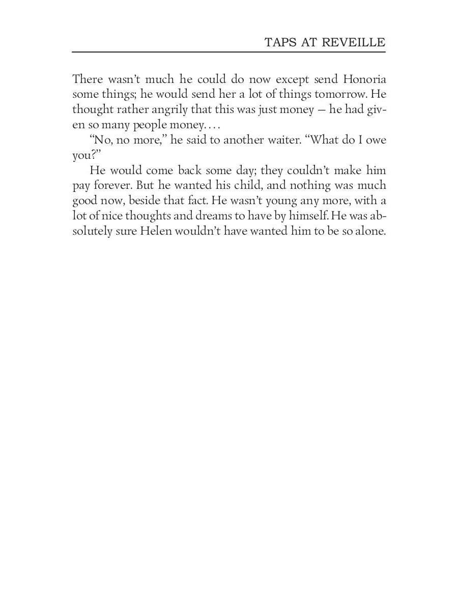 F.S. Fitzgerald was an American writer, whose works illustrate the Jazz Age. Taps at Reveille is a collection of brilliant short stories, including The Night of Chancellorsville - an ironic story in which a trainload of light ladies is catapulted unawares into the realities of the Civil War.