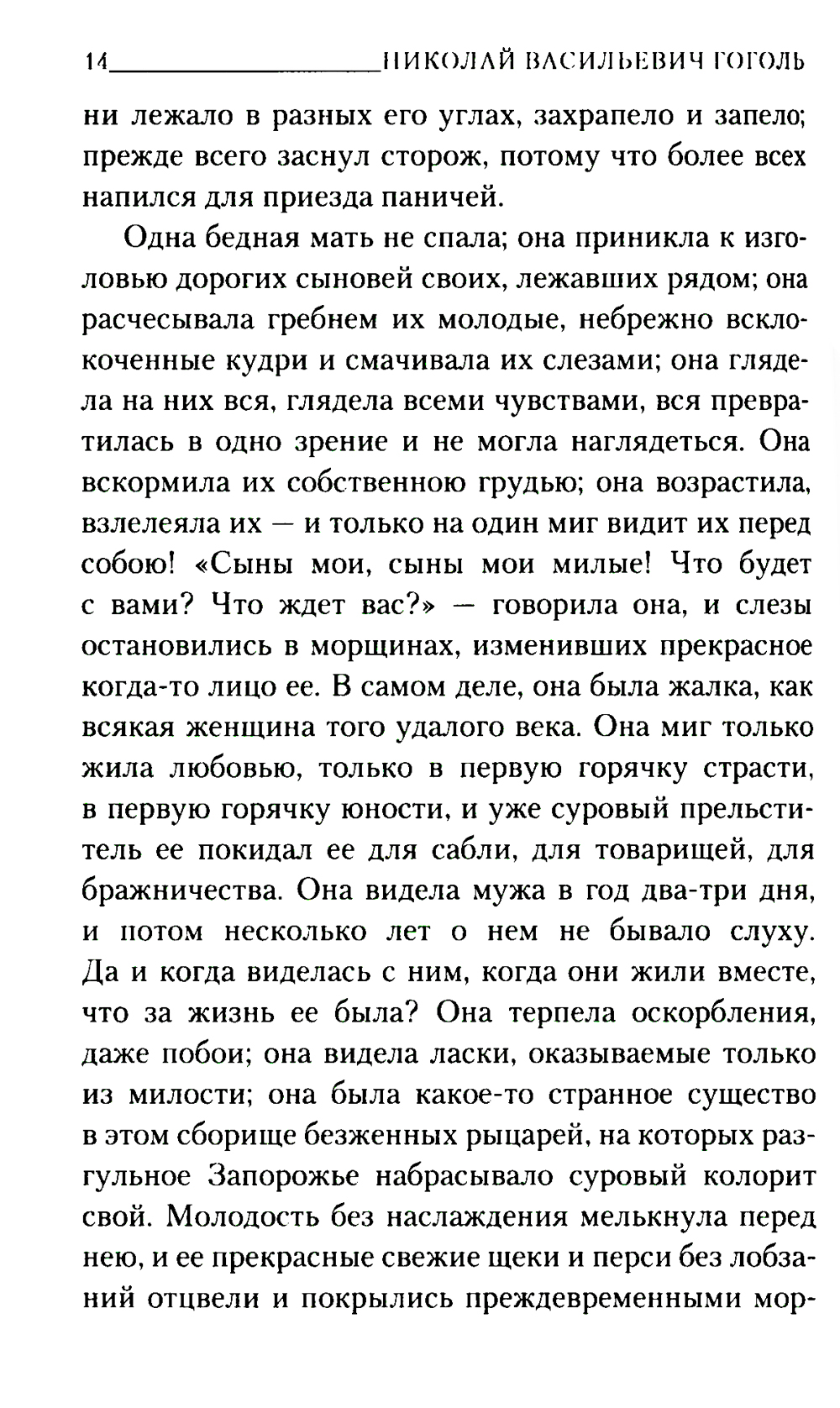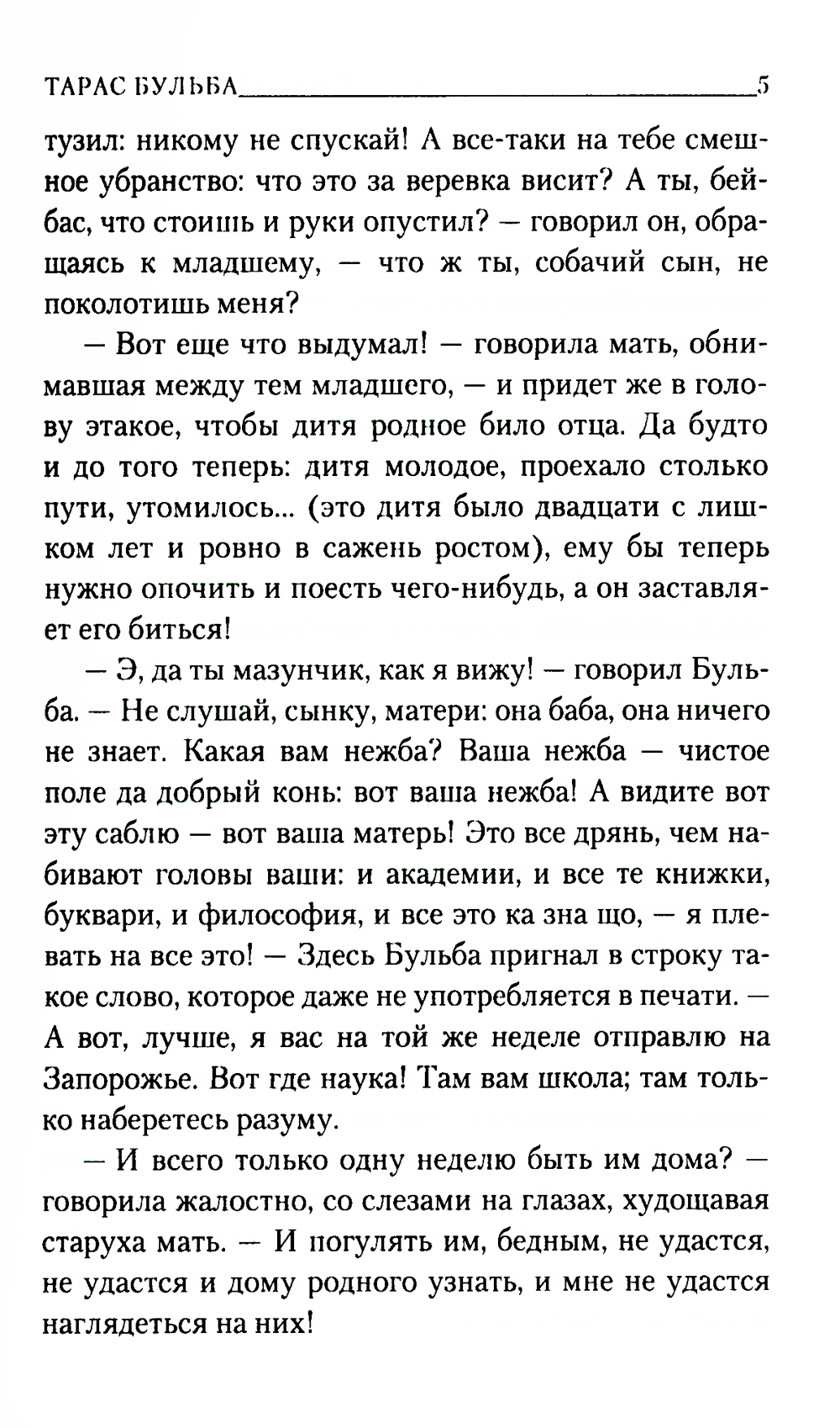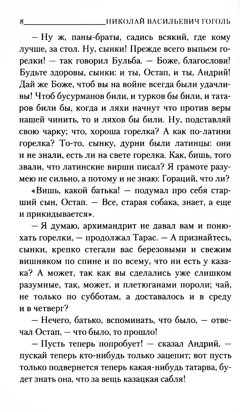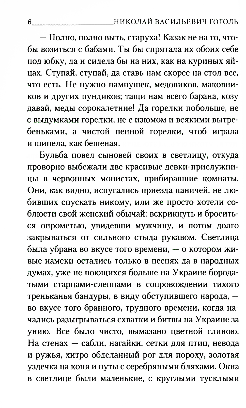 Николай Васильевич Гоголь (1809-1852) - известный прозаик и драматург, классик русской литературы. О собственном творчестве Гоголь говорил: «У меня только то и выходило хорошо, что взято было мной из действительности». Писатель часто обращался к мифам, легендам и прочим фольклорным источникам, отчего реальный мир в его произведениях часто переплетался с фантастическим. Повесть «Тарас Бульба» входит в цикл «Миргород» и рассказывает о жизни запорожских казаков первой половины XVII века. Полковник Тарас Бульба хочет испытать своих сыновей в бою и берет их в военный поход. Белинский писал о главном герое: «У этого человека была идея, которою он жил и для которой он жил… он не пережил ее, он умер вместе с нею… Для нее убил он собственною рукою милого сына, для нее он умер и сам». Это героический эпос о любви и предательстве, о долге и чести, доблести и жестокости.| Издательство | Омега-Л |
