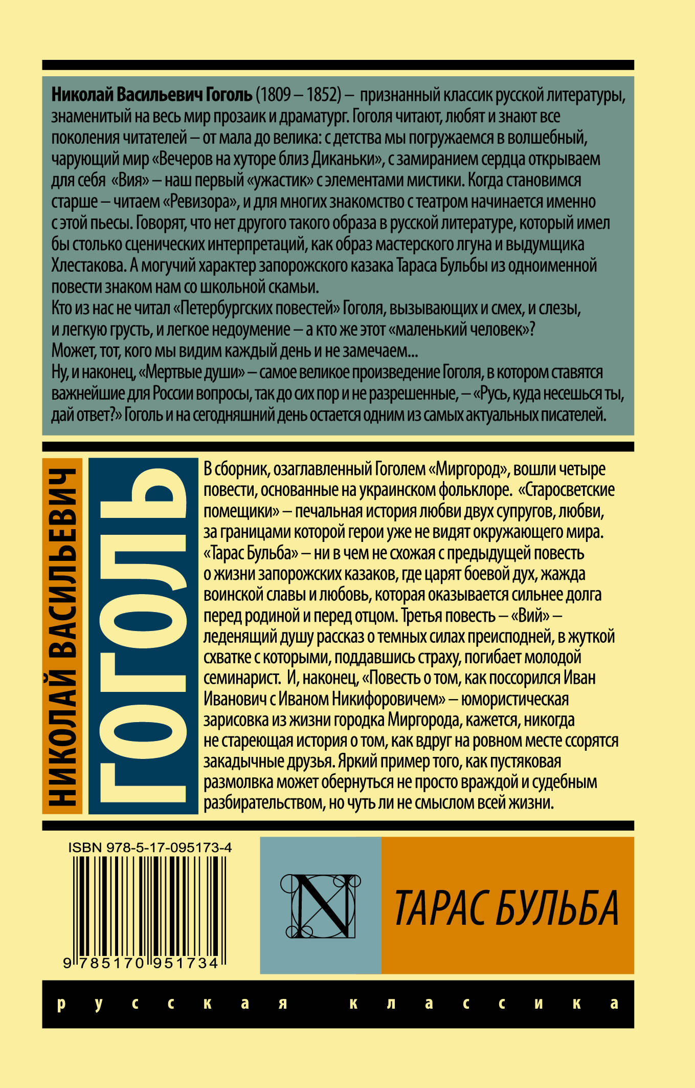 В сборник, озаглавленный Гоголем "Миргород", вошли четыре повести, основанные на украинском фольклоре. "Старосветские помещики" - печальная история любви двух супругов, любви, за границами которой герои уже не видят окружающего мира. "Тарас Бульба" - ни в чем не схожая с предыдущей повесть о жизни запорожских казаков, где царят боевой дух, жажда воинской славы и любовь, которая оказывается сильнее долга перед родиной и перед отцом. Третья повесть - "Вий" - леденящий душу рассказ о темных силах преисподней, в жуткой схватке с которыми, поддавшись страху, погибает семинарист. И, наконец, "Повесть о том, как поссорился Иван Иванович с Иваном Никифоровичем" - юмористическая зарисовка из жизни городка Миргорода, кажется, никогда не стареющая история о том, как вдруг на ровном месте ссорятся закадычные друзья. Яркий пример того, как пустяковая размолвка может обернуться не просто враждой и судебным разбирательством, но чуть ли не смыслом всей жизни.| Издательство | Издательство "АСТ" |