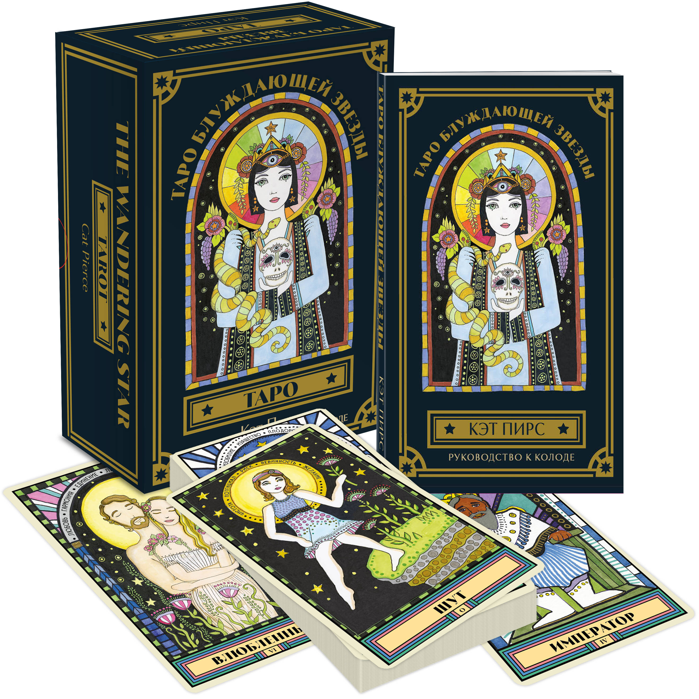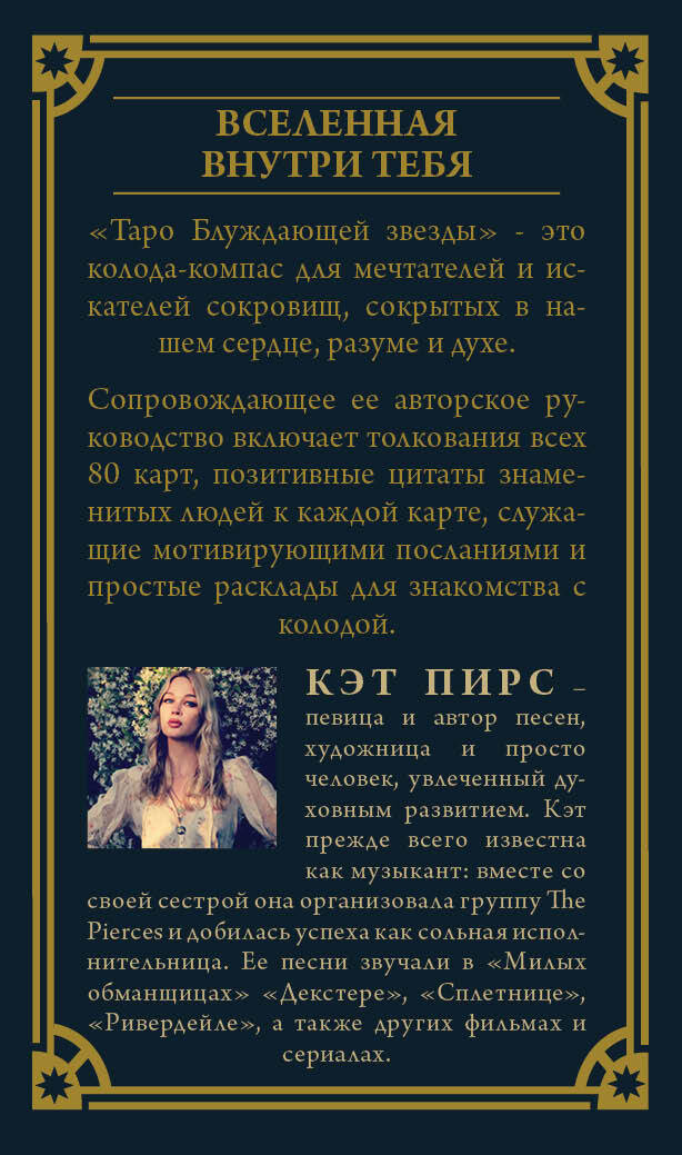 Следуй за своей Путеводной звездой - вперед к мечте! «Таро Блуждающей звезды» Кэт Пирс, полностью нарисованная от руки, - это волшебная колода-компас для мечтателей и искателей сокровищ, сокрытых в нашем сердце, разуме и духе. «Таро блуждающей звезды» - это: • 78 карт, следующих традиции Таро Уэйта, с ключами-подсказками, облегчающими запоминание значений и толкование раскладов. • 2 дополнительные авторские карты: Мать-Звезда и Создатель. • Авторское руководство к колоде со значениями всех карт и простыми раскладами. • Удобная компактная коробка из плотного картона, украшенная фольгой. Кэт Пирс - певица и автор песен, художница и просто человек, увлеченный духовным развитием. Кэт прежде всего известна как музыкант: вместе со своей сестрой она организовала группу The Pierces и добилась успеха как сольная исполнительница. Ее песни звучали в «Милых обманщицах» «Декстере», «Сплетнице», «Ривердейле», а также других фильмах и сериалах.