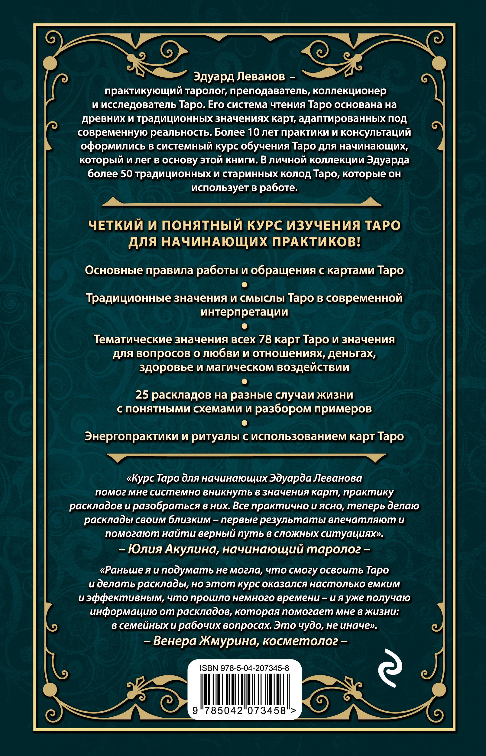 Четкий и понятный курс изучения Таро для начинающих практиков! Есть ли у наших отношений перспективы? Верен ли он мне? Чего ждать от новой работы? Каким будет мое будущее? «Таро для начинающих» - книга для тех, кто хочет получить ясные ответы на самые животрепещущие вопросы при помощи Таро и начать самостоятельно читать карты. «Таро для начинающих» Эдуарда Леванова - это: • Основные правила работы и обращения с картами Таро. • Традиционные значения и смыслы Таро в современной интерпретации. • Тематические значения всех 78 карт Таро и значения для вопросов о любви и отношениях, деньгах, здоровье и магическом воздействии. • 25 раскладов на разные случаи жизни с понятными схемами и разбором примеров. • Энергопрактики и ритуалы с использованием карт Таро. Эдуард Леванов - практикующий таролог, преподаватель, коллекционер и исследователь Таро. Его система чтения Таро основана на древних и традиционных значениях карт, адаптированных под современную реальность. Более 10 лет практики и консультаций оформились в системный курс обучения Таро для начинающих, который и лег в основу этой книги. В личной коллекции Эдуарда более 50 традиционных и старинных колод Таро, которые он использует в своей работе.| Издательство | ООО "Издательство "Эксмо" |