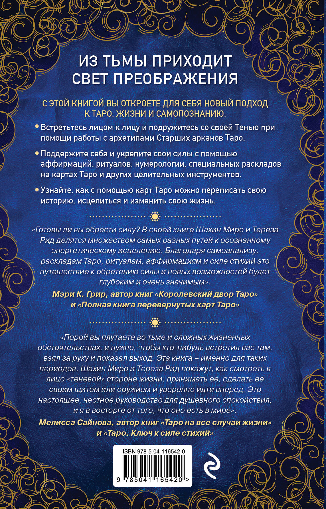 Эта книга - о том, как научиться переживать самые непростые жизненные этапы и темные времена с помощью карт Таро и других полезных магических практик и инструментов. В ней «леди Таро» Тереза Рид и Шахин Миро рассказывают, как поддержать себя, освободиться от вредных привычек, разрушительных эмоций, а также - превратить свои слабости в силу, встретившись лицом к лицу со своей Тенью. «Порой вы плутаете во тьме и сложных жизненных обстоятельствах, и нужно, чтобы кто-нибудь встретил вас там, взял за руку и показал выход. Эта книга - именно для таких периодов. Шахин Миро и Тереза Рид покажут, как смотреть в лицо "теневой" стороне жизни, принимать ее, сделать ее своим щитом или оружием и уверенно идти вперед. Эта книга - безопасное гавань для тех, кто борется, это настоящее, честное руководство для душевного спокойствия, и я в восторге от того, что оно есть в мире». - Мелисса Сайнова, автор книг «Таро на все случаи жизни» и «Таро. Ключ к силе стихий» Эта книга поможет вам: • Подружиться со своей Тенью и сделать ее своим союзником с помощью архетипов Старших арканов Таро. • Укрепить свои силы с помощью аффирмаций, ритуалов, нумерологии, специальных раскладов на картах Таро и других целительных инструментов. • Узнать, как с помощью карт Таро можно переписать свою историю, исцелиться и изменить свою жизнь. «Готовы ли вы обрести силу? В своей книге Шахин Миро и Тереза Рид делятся множеством самых разных путей к осознанному энергетическому исцелению. Благодаря самоанализу, раскладам Таро, ритуалам, аффирмациям и силе стихий это путешествие к обретению силы и новых возможностей будет глубоким и очень значимым». - Мэри К. Грир, автор книг «Королевский двор Таро» и «Полная книга перевернутых карт Таро» Тереза Рид, «леди Таро», профессионально занимается Таро уже тридцать лет. Является автором альбома-бестселлера для раскрашивания, посвященного Таро. Постоянная участница мировых конференций, посвященных Таро. Помимо Таро, в сферу интересов Терезы входит йога, кошки, кулинария и все, что имеет отношение к «Игре престолов», но больше всего она любит проводить время в кругу семьи, со своими детьми и мужем. Тереза живет в Висконсине. Шахин Миро - создатель колоды «Оракул Лунного кочевника». Шахин ведет блог об исцелении и канал на YouTube, помогая людям по всему миру избавиться от негативных эмоций, очистить свою энергию и расширить свои возможности при помощи работы с намерениями. Шахин любит ночное караоке, замшевые туфли на платформе и просмотр «Практической магии» на повторе. Он кочевник и живет по всему миру.| Издательство | ООО "Издательство "Эксмо" |