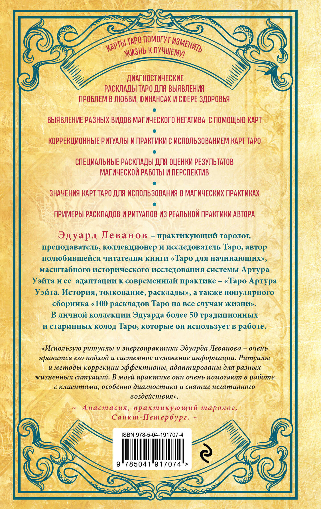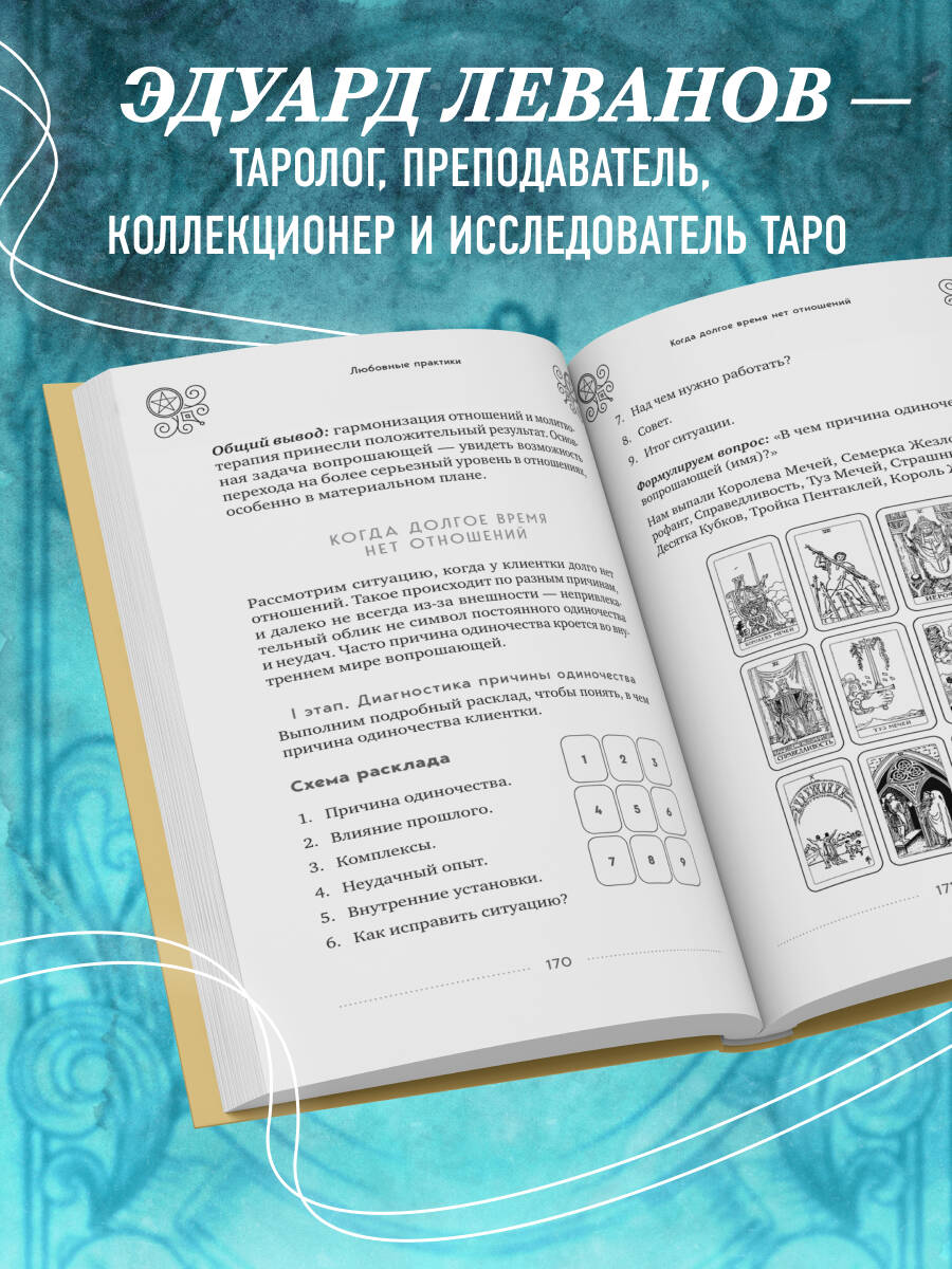 Не складываются отношения? На работе одни неприятности, а деньги утекают сквозь пальцы? Вас преследуют сплошные неудачи? Что происходит и что с этим делать? Обратитесь к Таро: карты не только ответят на ваши вопросы и прояснят ситуацию, но и помогут изменить ситуацию к лучшему. Как именно - в своей новой книге рассказывает Эдуард Леванов. В этой книге вы найдете: • Диагностические расклады Таро для выявления проблем в любви и финансах и сфере здоровья. • Выявление разных видов магического негатива с помощью карт. • Коррекционные ритуалы и практики с использованием карт Таро. • Специальные расклады для оценки результатов магической работы и оценки перспектив. • Значения карт Таро для использования в магических практиках. • Примеры раскладов и ритуалов из реальной практики автора. Эдуард Леванов - практикующий таролог, преподаватель, коллекционер и исследователь Таро, автор полюбившейся читателям книги «Таро для начинающих», путеводителя по самой популярной колоде Таро - «Таро Артура Уэйта. История, толкование, расклады», а также книги по раскладам «100 раскладов Таро на все случаи жизни». Его система чтения Таро основана на древних и традиционных значениях карт, адаптированных под современную реальность. В личной коллекции Эдуарда более 50 традиционных и старинных колод Таро, которые он использует в работе.| Издательство | ООО "Издательство "Эксмо" |