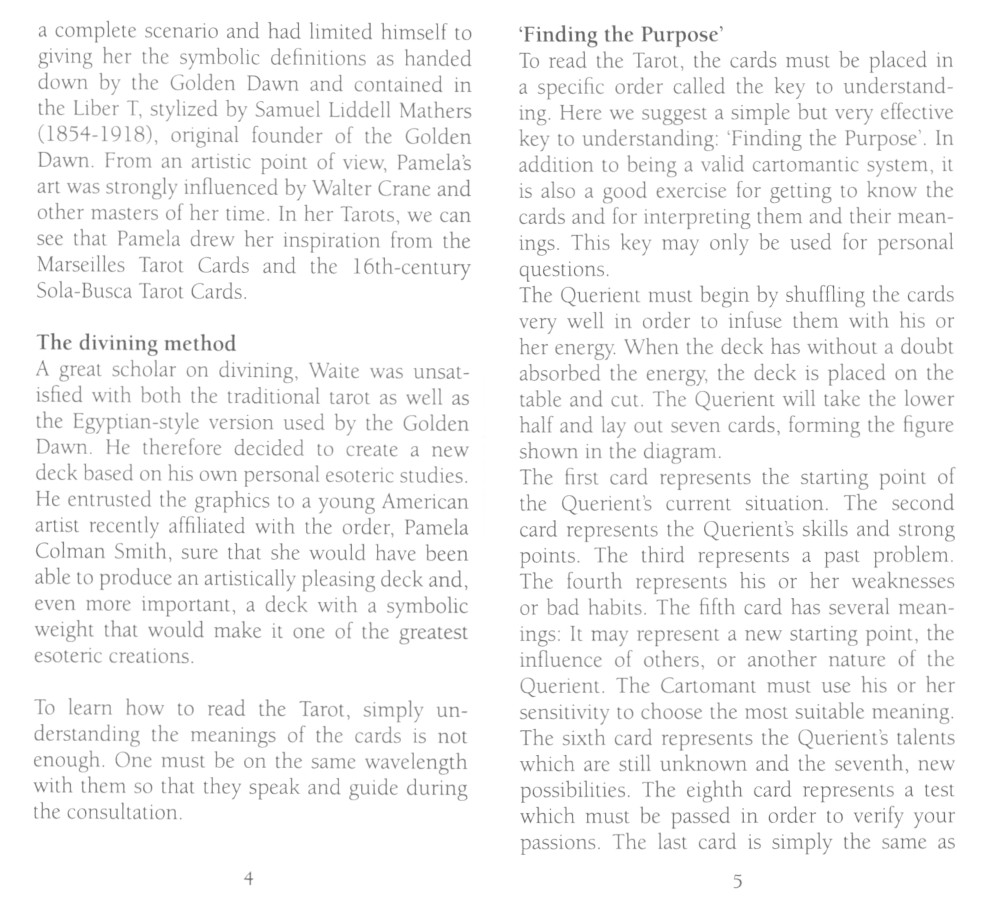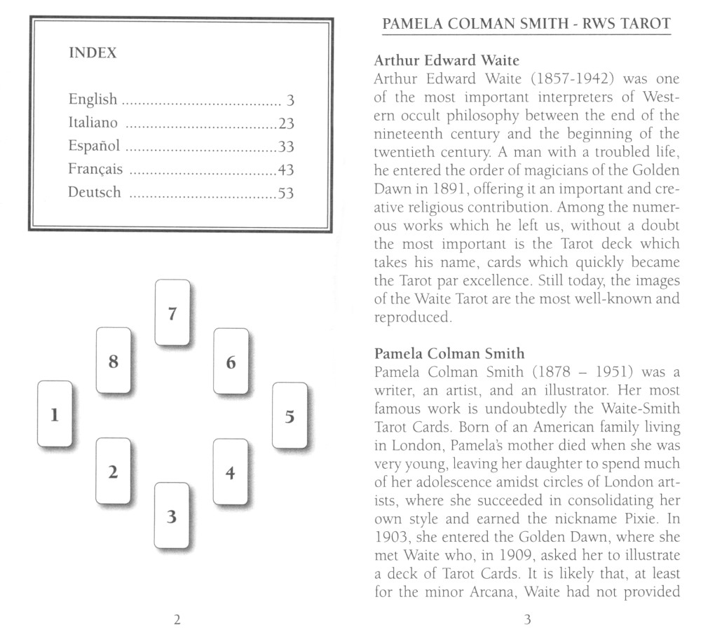 Один из самых популярных дизайнов колоды Таро. Разработан Артуром Эдвардом Уэйтом, знаменитым исследователем масонства, каббалы и мистических учений, видным членом Ордена «Золотой Зари». Под руководством Уэйта американская художница Памела Колман-Смит, также состоявшая в ордене, нарисовала уникальную 78-листную колоду карт, первым издателем которой был Уильям Райдер (Лондон). Карты и инструкция на английском языке.| Издательство | Аввалон-Ло Скарабео |