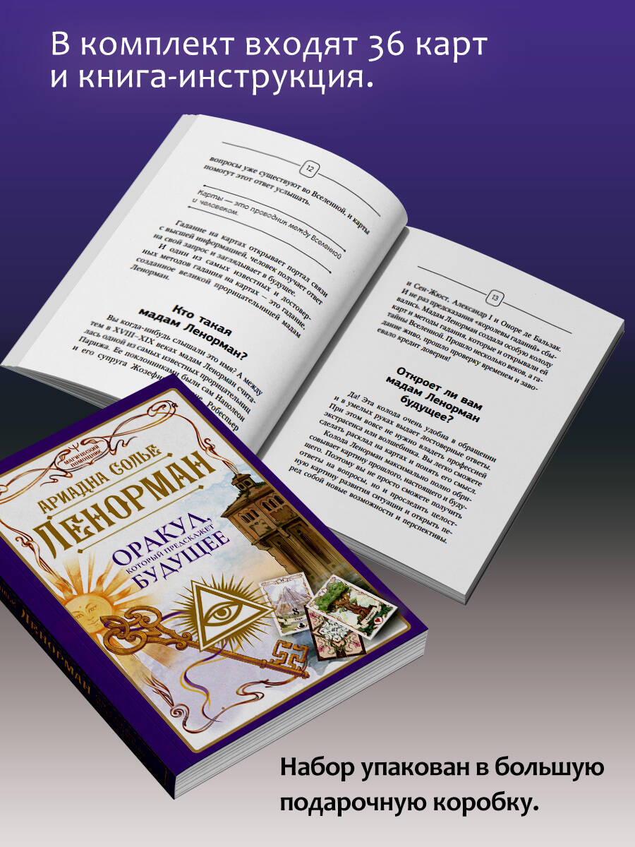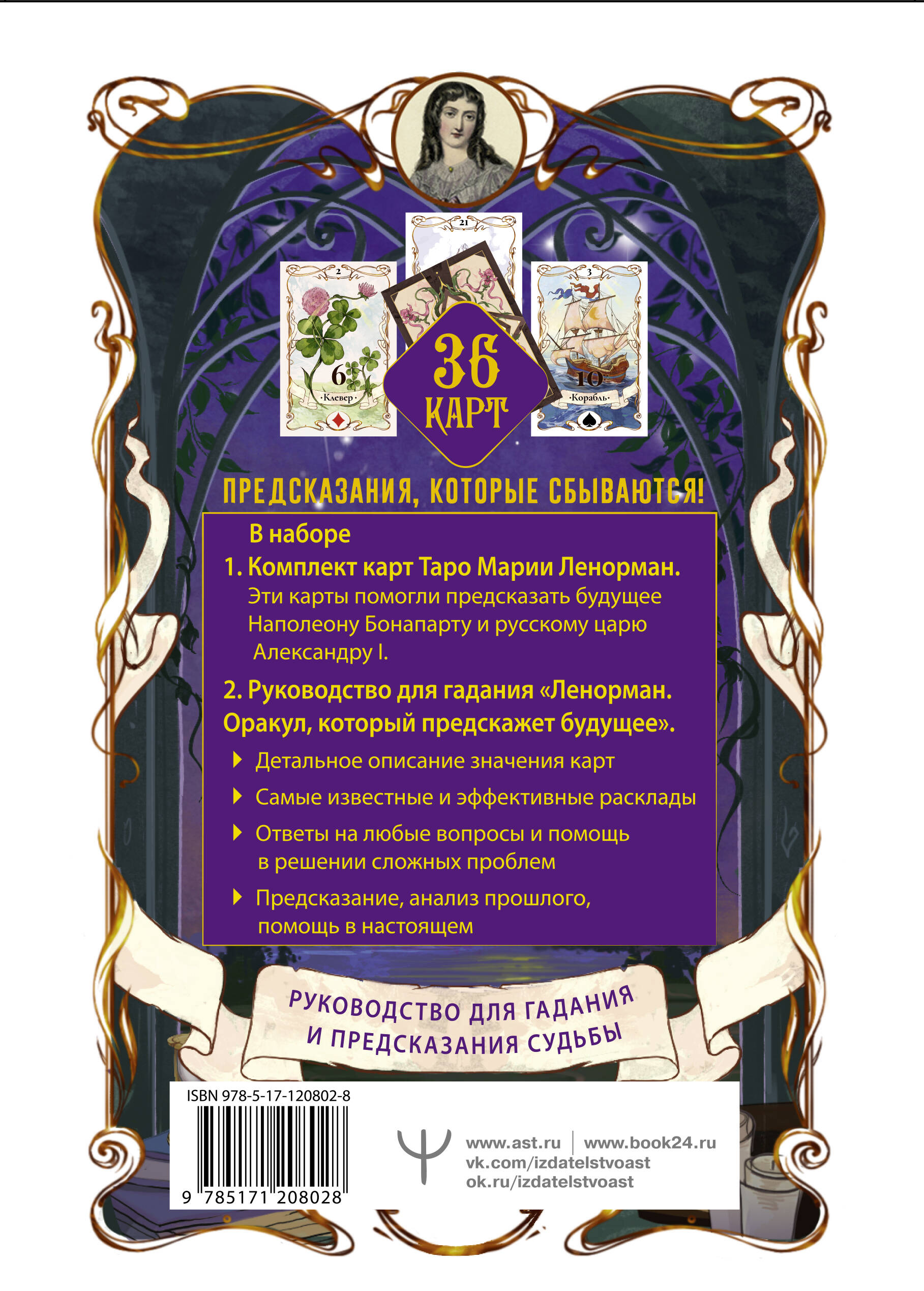 Она предсказала судьбу Марии-Антуанетте и свадьбу с коронованной особой Жозефине Богарне, будущей жене Наполеона, к ее советам с вниманием прислушивался русский император Александр I. Эта великая женщина создала свою систему гадания и свою предсказательную колоду, которая стала одной из самых востребованных в мире. Изучив систему гадания Марии Ленорман, вы сможете сделать точные предсказания и даже составить детальное описание будущих событий (на день, неделю, месяц, год, несколько лет). Специальные расклады, которые вы найдете в книге, помогут получить ответы на сложные вопросы, спрогнозировать развитие любых отношений, узнать, какие люди вас окружают и что они о вас думают. В книге вы также найдете карты, которые можно вырезать и использовать для гадания. В составе подарочного комплекта - коробка, книга в твердом переплете с вырезными картами, колода 36 карт. Подходит для начинающих.| Издательство | ИЗДАТЕЛЬСТВО "АСТ" |