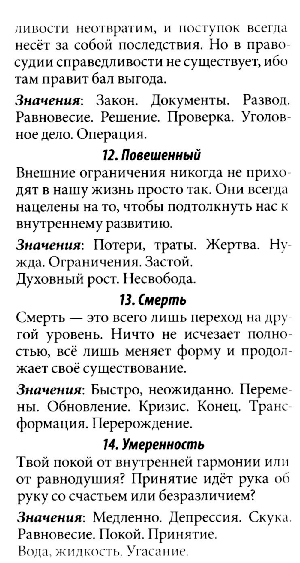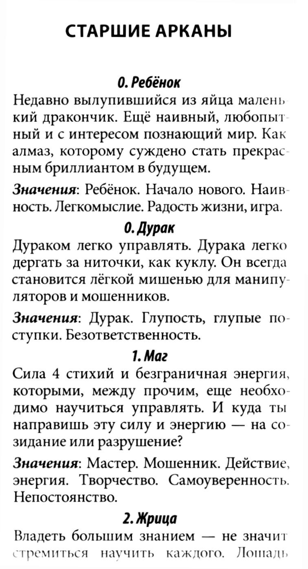 Много лет я собирала и коллекционировала иллюстрации с этими фантастическими существами. И, как-то незаметно для меня, эти иллюстрации стали складываться в колоду карт. «А почему бы и да?» - подумала я. Нарисовать собственную колоду я очень хочу, но ограничена во времени. А колода из иллюстраций уже сложилась! И я очень надеюсь, что она станет для нас с вами проводником в мир скрытого и тайного! И еще пара важных «почему». Почему карты горизонтальные? Во-первых большинство иллюстраций имеют горизонтальную ориентацию, и обрезать такую красоту - просто кощунство. Во-вторых, это просто необычно и оригинально, а я люблю всё необычное. Почему в колоде 80 карт? Мне всегда хотелось разделить Шута на две карты: на Дурака и Ребёнка, а Влюблённых - на Влюбленных и Выбор. Из-за значительного различия в трактовках. Если Вам эта идея не близка, вы можете просто убрать дополнительные карты и пользоваться стандартными набором из 78 штук.| Издательство | Энигма |