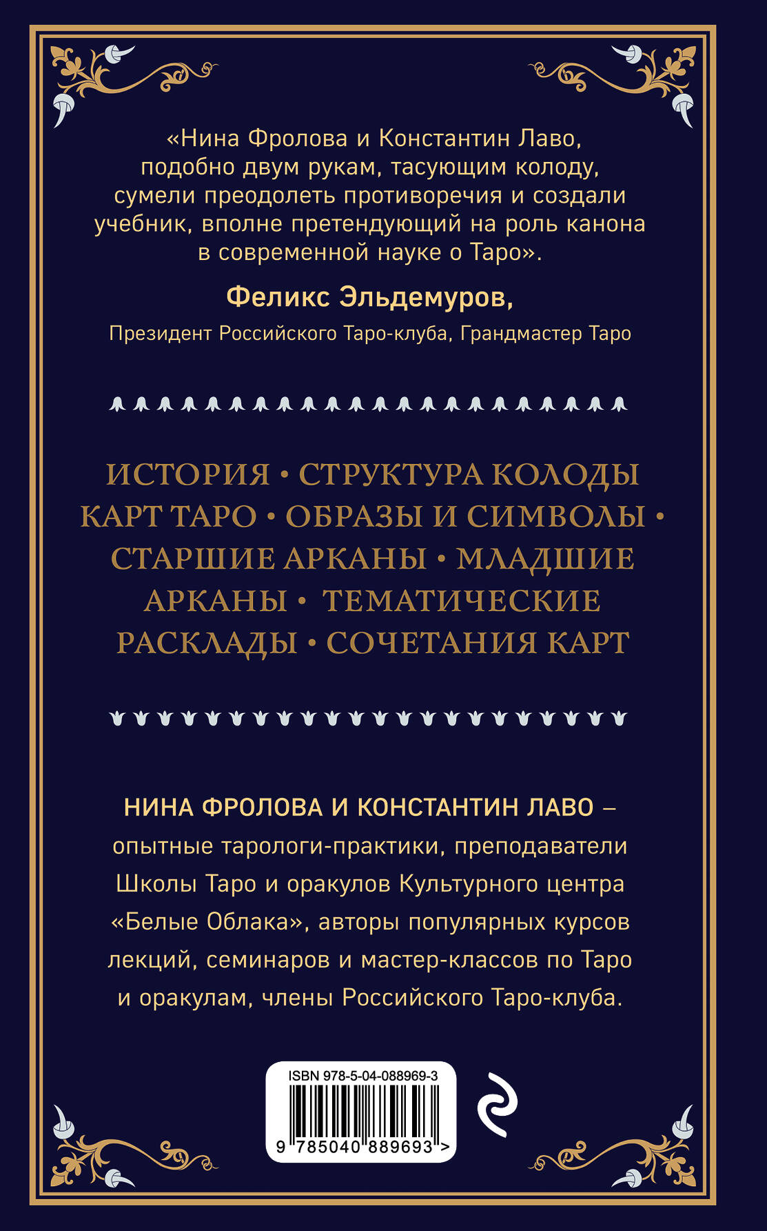 В книге тарологов и преподавателей с многолетним опытом, членов Российского Таро-клуба Нины Фроловой и Константина Лаво есть всё, что нужно, чтобы освоить теорию и практику работы с картами Таро и искусство предсказания. Для того чтобы увидеть будущее, прояснить скрытые причины и следствия событий и тайные мотивы, больше не нужно владеть сверхъестественными способностями. Логика, точность и системный подход авторов помогут получить ответы на все интересующие вопросы. В этой книге вы найдете: - Четкое представление о Таро как системе, его структуре и истории развития. - Знания, которые позволят сориентироваться в многообразном мире колод, в системах и традициях Таро. - Многоаспектное описание арканов Таро, их значений в прямом и перевернутом положении в удобной форме таблиц. - Ключевую информацию, необходимую для предсказательной практики. - Расклады различной степени сложности, правила их чтения и трактовки. - Более 20 практических заданий, которые помогут вам освоить искусство гадания. И многое другое! Нина Фролова - таролог-практик с 1991 года, преподаватель Школы Таро и оракулов Культурного центра «Белые Облака», автор курсов лекций, семинаров и мастер-классов по Таро и оракулам, психолог, расстановщик, Мастер-Учитель Рейки, автор книги «Симболон. Ступени к гармонии. Методическое пособие» и многочисленных статей, член Российского Таро-клуба. Константин Лаво - таролог-практик с 2001 года, директор и преподаватель Школы Таро и оракулов Культурного центра «Белые Облака», исследователь символических и предсказательных систем, автор курсов лекций, семинаров и мастер-классов по Таро и оракулам, практический психолог, расстановщик, Мастер Рейки, автор статей, член Российского Таро-клуба, член Американской ассоциации Таро. «Нина Фролова и Константин Лаво, подобно двум рукам, тасующим колоду, сумели преодолеть противоречия и создали учебник, вполне претендующий на роль канона в современной науке о Таро». - Президент Российского Таро-Клуба, Грандмастер Таро Феликс Эльдемуров| Издательство | ООО "Издательство "Эксмо" |