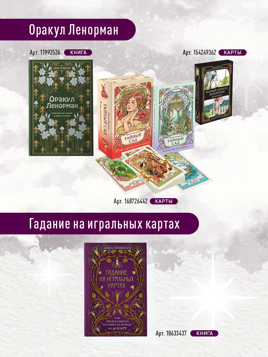Простое и понятное руководство по картам Таро для начинающих от Анны Огински, руководителя учебного центра «Академия Ленорман», автора книг и статей, специалиста по различным мантическим системам, поможет вам познакомиться с Таро и освоить искусство чтения карт. В этой книге вы найдете все, что нужно, чтобы начать раскладывать и толковать карты, получая ответы на волнующие вопросы. Вас ждет: • Краткая историю карт Таро. • Описание структуры и состава колоды Таро. • Толкование всех карт колоды в прямом и перевернутом положении в удобном и понятном формате. • Техники чтения карт с примерами. • Базовые расклады на самые волнующие темы. АННА ОГИНСКИ - руководитель учебного центра «Академия Ленорман», автор книг «Оракул Ленорман. Самоучитель по гаданию и работе с картами» и «Гадание на игральных картах», руководства к оракулу Ленорман «Нити судьбы» и «Таро Доброй сказки», а также статей, курсов и материалов для самообучения по различным мантическим системам.| Издательство | ООО "Издательство "Эксмо" |