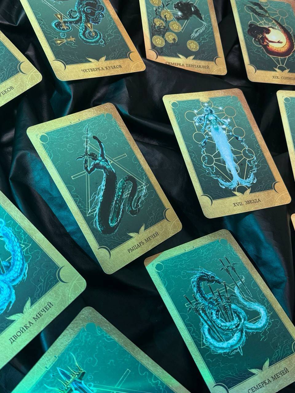 Одна из самых красивых и загадочных колод Таро, связанная со стихией Воды в ее космическом воплощении. Вода - это не просто субстанция, а праматеринская стихия, колыбель жизни. Она возвращает человека к самому себе, указывает его истинное предназначение и призвание. Недаром космос в древности воспринимался людьми как небесное море, по которому плывут большие корабли созвездий и маленькие лодочки отдельных звезд. Каждый элемент Таро "Сердце ведьмы" наполнен магией. Рубашка - изображение Древа Жизни Сефирот, а на фоне карт Младших Арканов есть алхимические символы, которые соответствуют энергии карты и усиливают ее. В каждой масти вас встретят фамильяры ведьмы: свирепый марул, хитрый северный дракон, могучий кракен из затерянного океана и ожидающий своего часа удильщик. Все вместе делает колоду уникальной. Вы можете использовать ее как для гадания, так и для трансформационных игр и проработки разных ситуаций. Задайте свой вопрос, достаньте карту и погрузитесь в глубины подсознания через образы, изображенные на ней. Художница колоды - Луба Карасик, автор иллюстраций к известным колодам "Таро Зеленой магии" и "Таро Зеленого пути". В колоде 78 карт и подробное руководство. Карты и брошюра упакованы в большую коробку. Колода также издается в маленькой коробке (без подробного руководства) под названием "Таро Ведьма темных глубин".| Издательство | Издательство "АСТ" |
