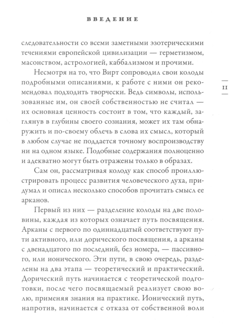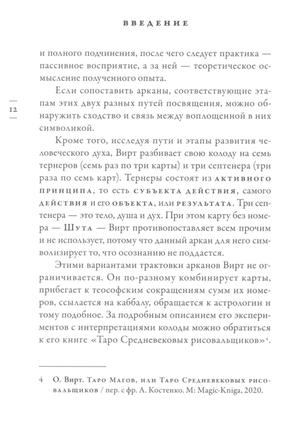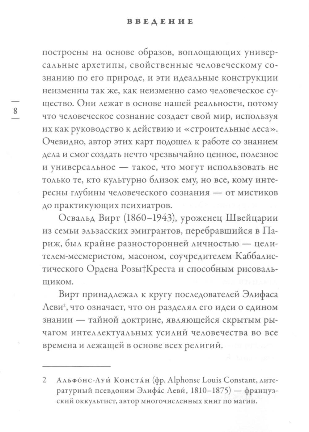 Элизабет Хейч (1897-1994) - художник и мистик, основательница старейшей в Европе школы хатха-йоги и автор многочисленных книг, посвященных духовному совершенствованию. В широкий круг ее интересов попали и Старшие Арканы карт Таро, которые она использовала как инструмент для того, чтобы помогать своим ученикам на пути их духовного становления, а впоследствии посвятила им книгу-инструкцию Мудрость Таро, описывающую полный путь развития человеческого сознания. Для своих целей из многочисленных колод она выбрала Таро средневековых рисовальщиков (Le Tarot des imagiers du Moyen age) Освальда Вирта, потому что увидела в них точные символические изображения двадцати двух универсальных уровней сознания, которые, по ее мнению, свойственны человеческой природе как таковой. А если это действительно так, то любой человек может увидеть в этих картах отражение собственных переживаний. Так что эти символы знакомы даже тем, кто никогда не видел карт Таро, - ведь они не произвольны. Композиции Старших Арканов Таро Вирта построены на основе образов, воплощающих универсальные архетипы, свойственные человеческому сознанию по его природе, и эти идеальные конструкции неизменны так же, как неизменно само человеческое существо. Они лежат в основе нашей реальности, потому что человеческое сознание создает свой мир, используя их как руководство к действию и строительные леса. Очевидно, автор этих карт подошел к работе со знанием дела и смог создать нечто чрезвычайно ценное, полезное и универсальное - такое, что могут использовать не только те, кто культурно близок ему, но все, кому интересны глубины человеческого сознания - от мистиков до практикующих психиатров.| Издательство | Издательский бутик "Книжные сети" |