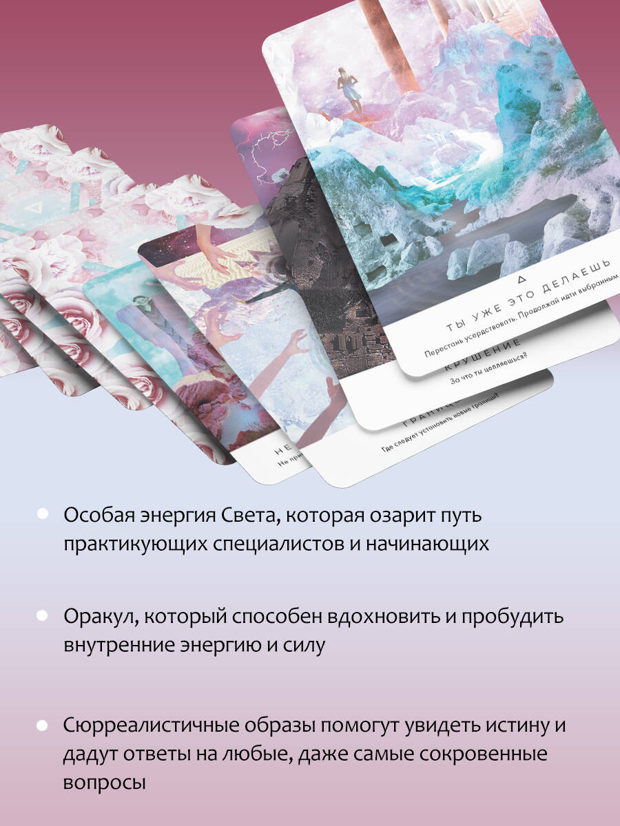 Уникальное подарочное издание одной из самых популярных колод на Amazon не оставит равнодушным никого, кому близок мир Таро и Оракулов. Колоды всемирно известного мистика, эзотерика Ребекки Кэмпбелл отличаются особой женственной красотой, невероятной тонкостью понимания Души и простотой толкования. Каждая карта в колоде "Таро. Свет Вселенной. Задай свой самый сокровенный вопрос" пронизана магией Божественного женского голоса. Сюрреалистичные образы помогут увидеть истину, дадут ответы на любые, даже самые сокровенные вопросы, а особая энергия Света озарит ваш путь. Колода включает в себя 44 карты пяти видов: 1. Карты подтверждения дают однозначный ответ на ваш вопрос, по принципу "да - нет". Они рассчитаны на быстрое и четкое прояснение ситуации, каковы бы ни были привходящие обстоятельства. 2. Карты запроса помогут вам услышать подсказки, озвучить их и руководствоваться ими в своих действиях. 3. Карты действия вдохновляют вас на совершение того или иного поступка, побуждают перейти от мыслей к действию. 4. Карты активации пробуждают внутренние энергии и целительные силы - ваши или человека, которому вы помогаете. Они показывают, какой ресурс нужен именно сейчас, и активируют его. К каждой из карт прилагается особая мантра, "призыв к активации". 5. Карты передачи помогают войти в контакт с энергиями, доступными вам в настоящий момент. Это очень сильные карты, которые соединяют вас с четырьмя другими мирами: мудрости, творчества, сознания и целительства. Каждый вид карт требует особого подхода и используется для предсказания событий и в собственной жизни, и в жизни других людей. В руководстве к колоде вы найдете все, что для этого нужно: • необходимые настройки; • подробное описание каждой карты; • расклады; • другие инструкции для эффективной работы с картами и своим внутренним светом. Откликнитесь на зов Света, и ваша жизнь будет легкой, понятной и гармоничной. В комплект входят 44 карты и брошюра-инструкция. Комплект упакован в большую подарочную коробку.| Издательство | ИЗДАТЕЛЬСТВО "АСТ" |