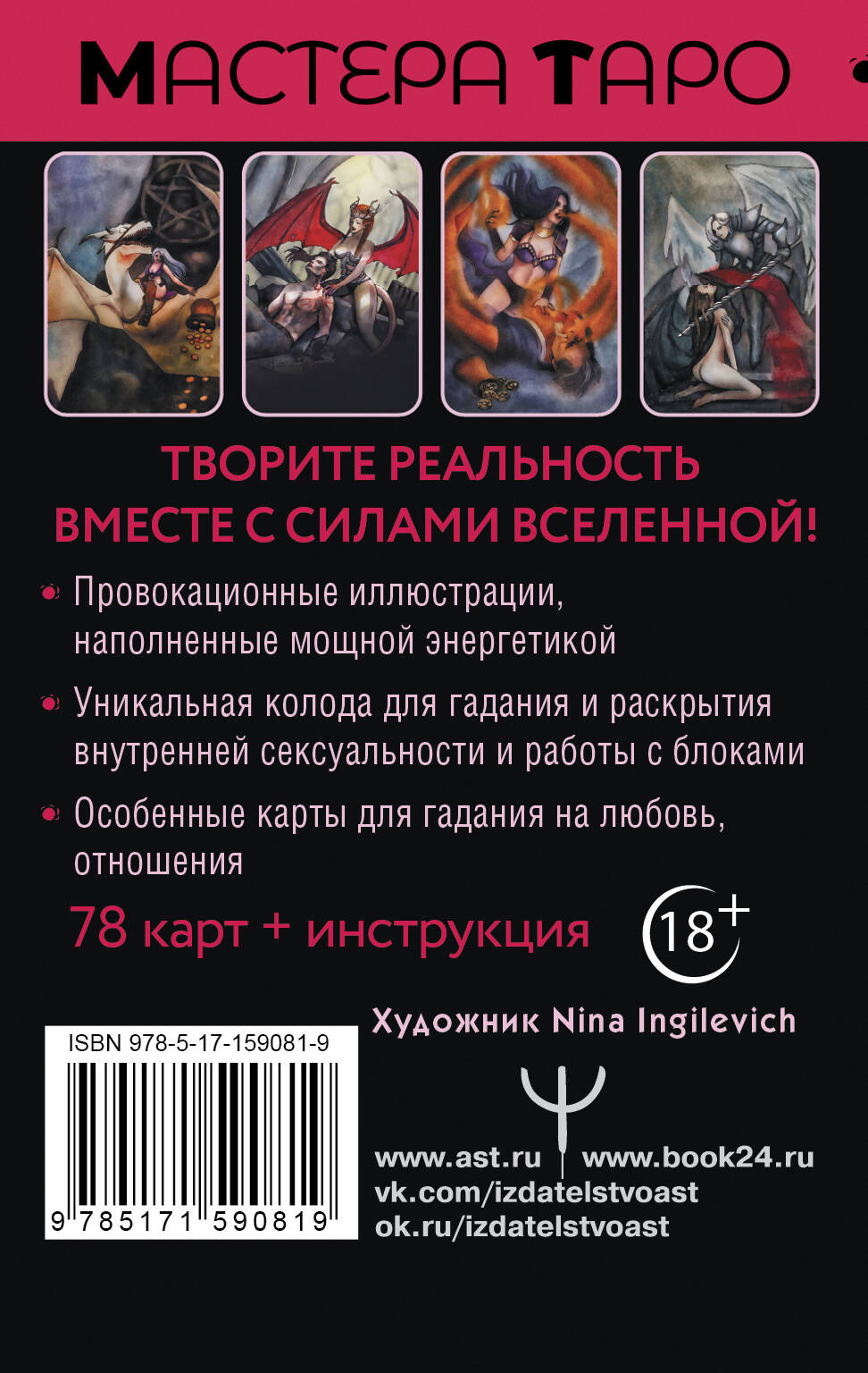 Перед вами уникальная колода, провокационная и пробуждающая воображение. Каждая иллюстрация в ней наполнена сакральной энергией творения - первичной магией Вселенной. Эротическая символика в сочетании с фэнтези-сюжетами работает как мощный инструмент разблокировки вашей сексуальности и творческой энергии. Работа с картами снимает внутренние блоки, помогает преодолеть предубеждения, обрести свободу и увидеть ситуацию в ее истинном свете. Вы удивитесь, насколько говорящей может быть эта колода. Откровенная символика не даст ей соврать - она показывает ситуацию как она есть, раскрывает ваши тайные желания и то, в чем вы сами не хотите себе признаться. Карты дадут точный ответ на любой вопрос и посоветуют, что делать. Особенно они любят общаться на тему любви и отношений, но и другие темы, в которых задействована энергия созидания (работа, финансы, будущее), не обойдут стороной. В колоде 78 карт и инструкция, они упакованы в качественную коробку под размер карт.| Издательство | Издательство "АСТ" |