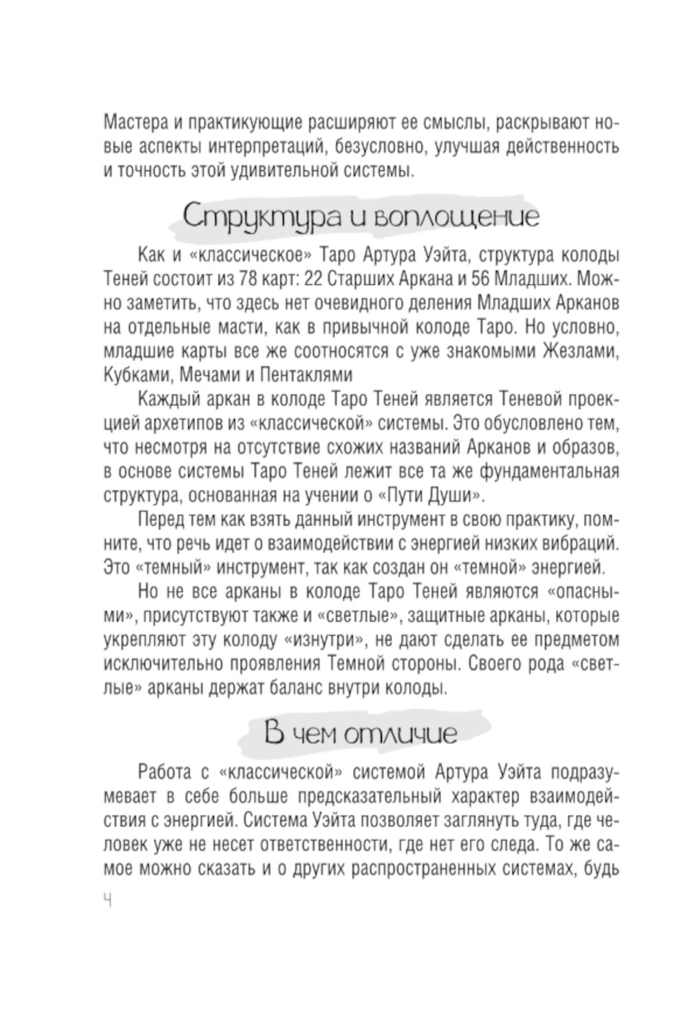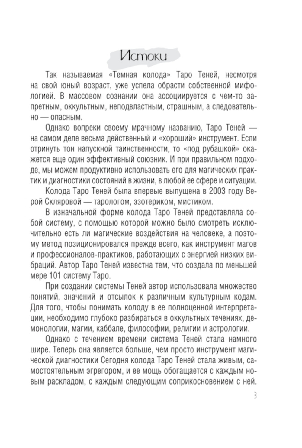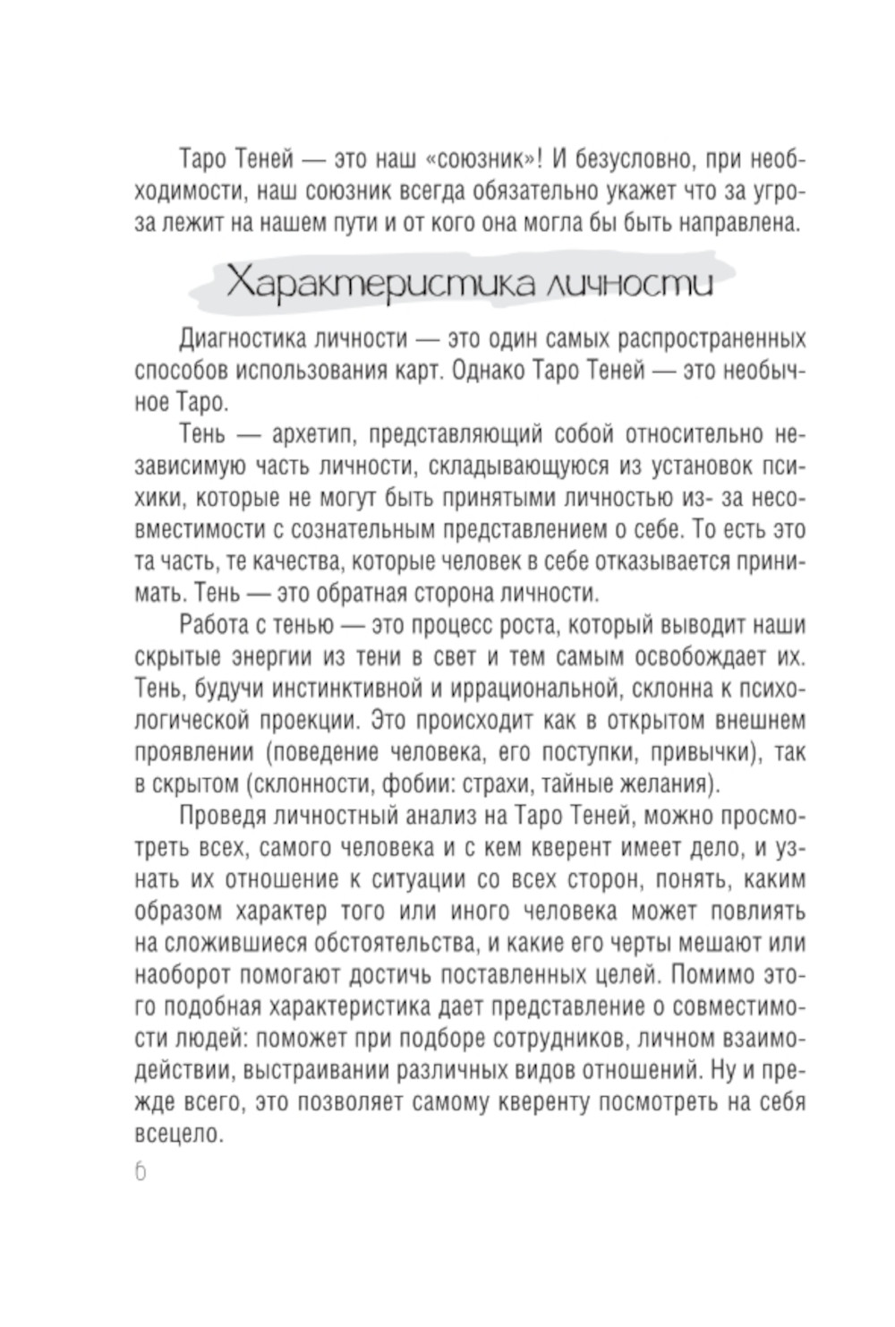 Колода Таро Теней дарит возможность узнать больше и начать применять в своей жизни вспомогательные инструменты. Человек, постигший знание о Теневых аспектах, становится практиком совершенно иного уровня, ведь благодаря этому появляется уникальная возможность заглянуть за грань видимого и познать нечто большее. Благодаря авторскому подходу колода обретает универсальное значение, позволяя каждому исследовать аспекты реальности. Получите не только новые знания, но и неожиданные открытия на пути самоисследования. Будьте готовы к сюрпризам. Ведь то, что ожидает вас за чертой, - невозможно предугадать заранее.| Издательство | АСТ |