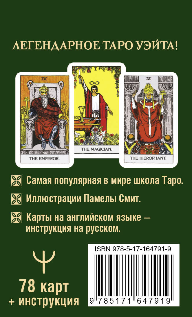 Таро Уэйта известно во всем мире. Это классическая, "вечная" колода, с которой советуют начинать работу с картами Таро. В этом издании названия карт даны на английском языке, как задумал их Артур Уэйт. Все иллюстрации авторства Памелы Смит и печатаются без искажений. Колода Таро Уэйта уже доказала, что является универсальным инструментом для предсказания будущего, признана тарологами и считается обязательной для всех, кто увлекается Таро. Вместе с колодой вы найдете небольшое руководство с рекомендациями и раскладами от самого великого мастера Таро. Карты ответят на любые вопросы, дадут возможность заглянуть в будущее, разобраться в себе и своем окружении. Колода отлично подходит как для начинающих, так и для профессиональных тарологов. Эти карты Таро так же эффективны, как и карты стандартного размера, но имеют дополнительные плюсы. Их можно использовать во время гадания для увеличения точности предсказания. В комплект входят 78 оригинальных карт Таро Уэйта и краткое руководство для гадания. Удобный компактный формат карт позволит всегда держать колоду при себе.| Издательство | Издательство "АСТ" |