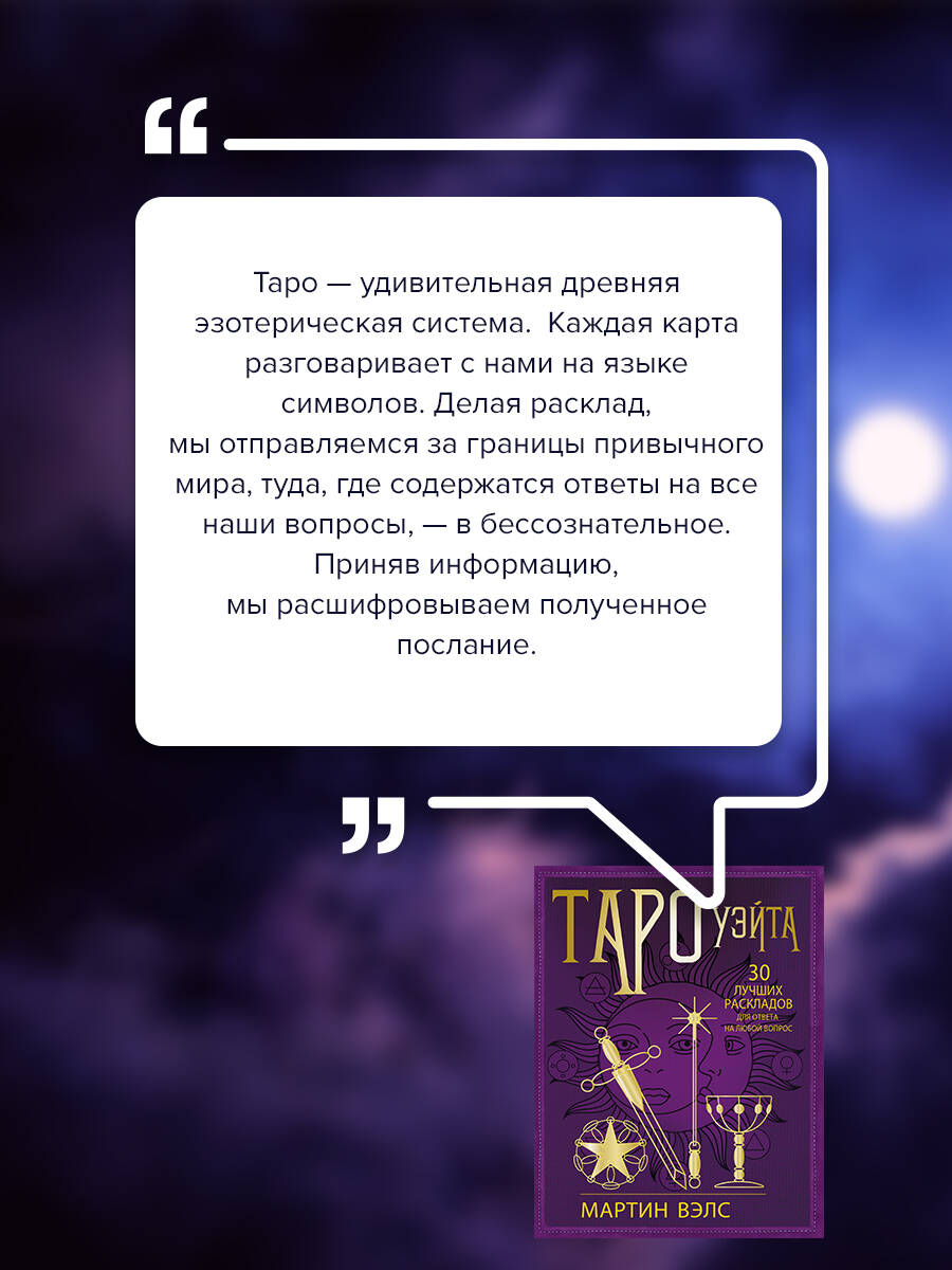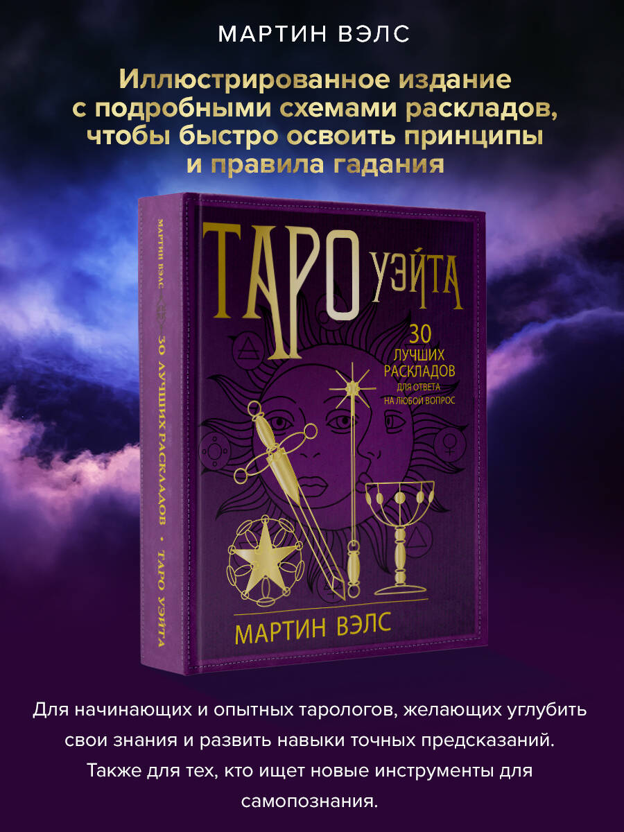 Признанный эксперт в эзотерике Мартин Вэлс представляет новую книгу "Таро Уэйта. 30 лучших раскладов для ответа на любой вопрос". Иллюстрированное издание с подробными схемами раскладов поможет вам быстро освоить принципы и правила гадания и с их помощью управлять своей жизнью. Карты Таро способны осветить будущее, открыть тайны прошлого, растолковать настоящее. Расклады помогают понять ситуацию, сформировать полную картину происходящего и сделать верные прогнозы на будущее. Значения карт в книге "Таро Уэйта. 30 лучших раскладов для ответа на любой вопрос" приводятся по классической колоде Артура Уэйта - первоисточнику, от которого происходит большинство современных колод. Но предложенные расклады вы сможете применять с любой колодой Таро, которая есть у вас под рукой. Расклады из этой книги сделают вас повелителем судьбы!| Издательство | АСТ |