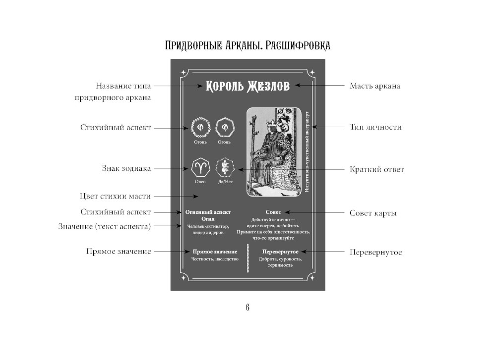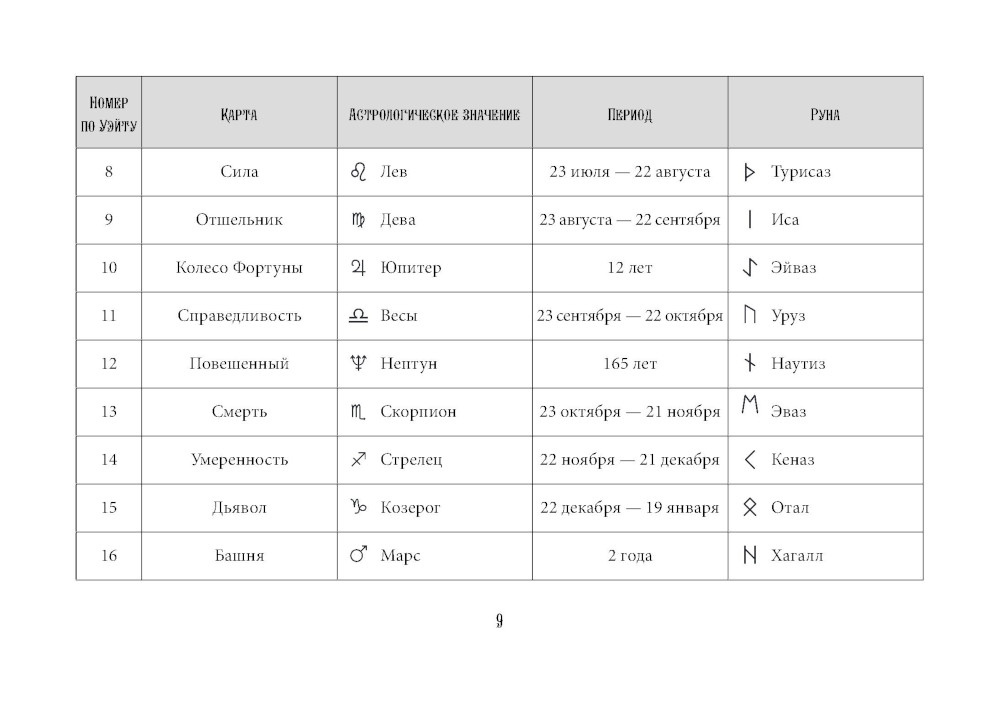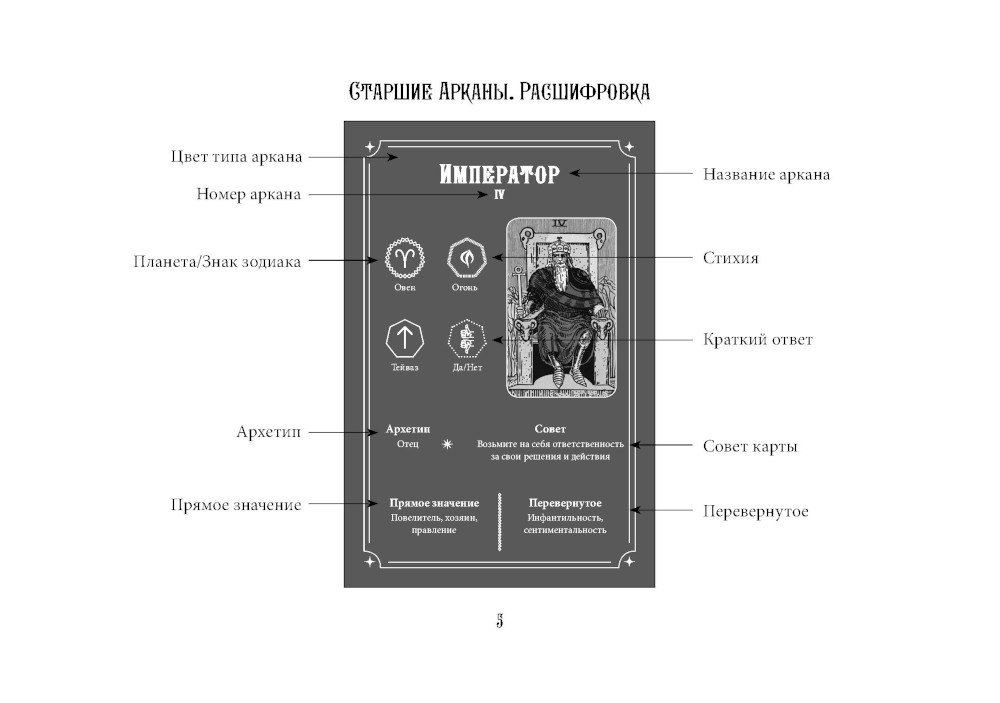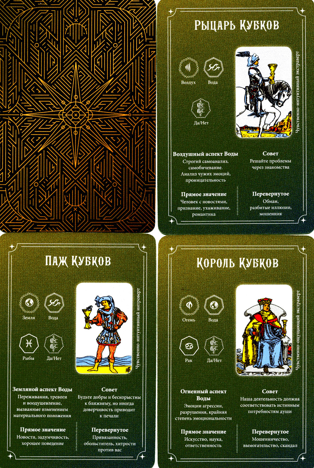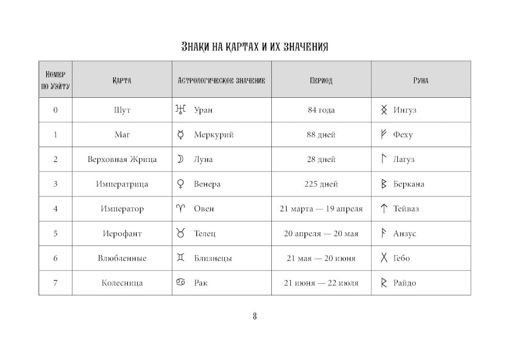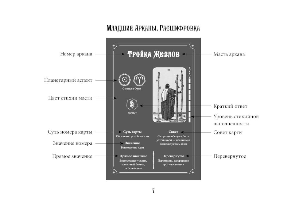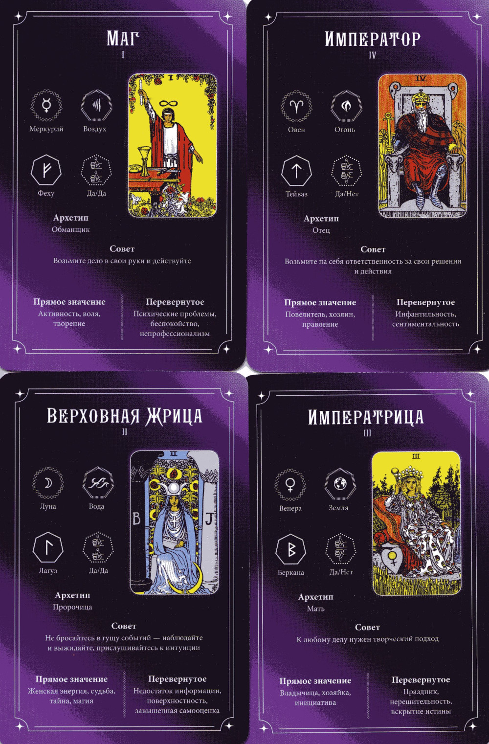 Если вы хотели обучиться гаданию на Таро, но вам сложно запоминать толкования, если вы не понимаете структуру арканов или не можете прочесть знаки - эта обучающая колода для вас. «Таро Уэйта. Эффективное обучение» - обучающее Таро нового поколения. На картах начерчены толкования, руны и астрологические знаки, которые помогут запомнить значения карт, увидеть на них больше информации и трактовать выпавшие карты точнее. Чтобы начать практиковать Таро, вам нужен только этот комплект: в книге 50 раскладов, каждый из которых вы можете разложить и сразу же трактовать. Доверяйте своим толкованиям с первого предсказания! В комплекте: колода из 78 карт с иллюстрациями Таро Уэйта с толкованиями, рунами и астрознаками на каждой карте и подробная инструкция по работе с колодой, включая дополнительные значения и 50 основных раскладов, все упаковано в подарочную коробку.