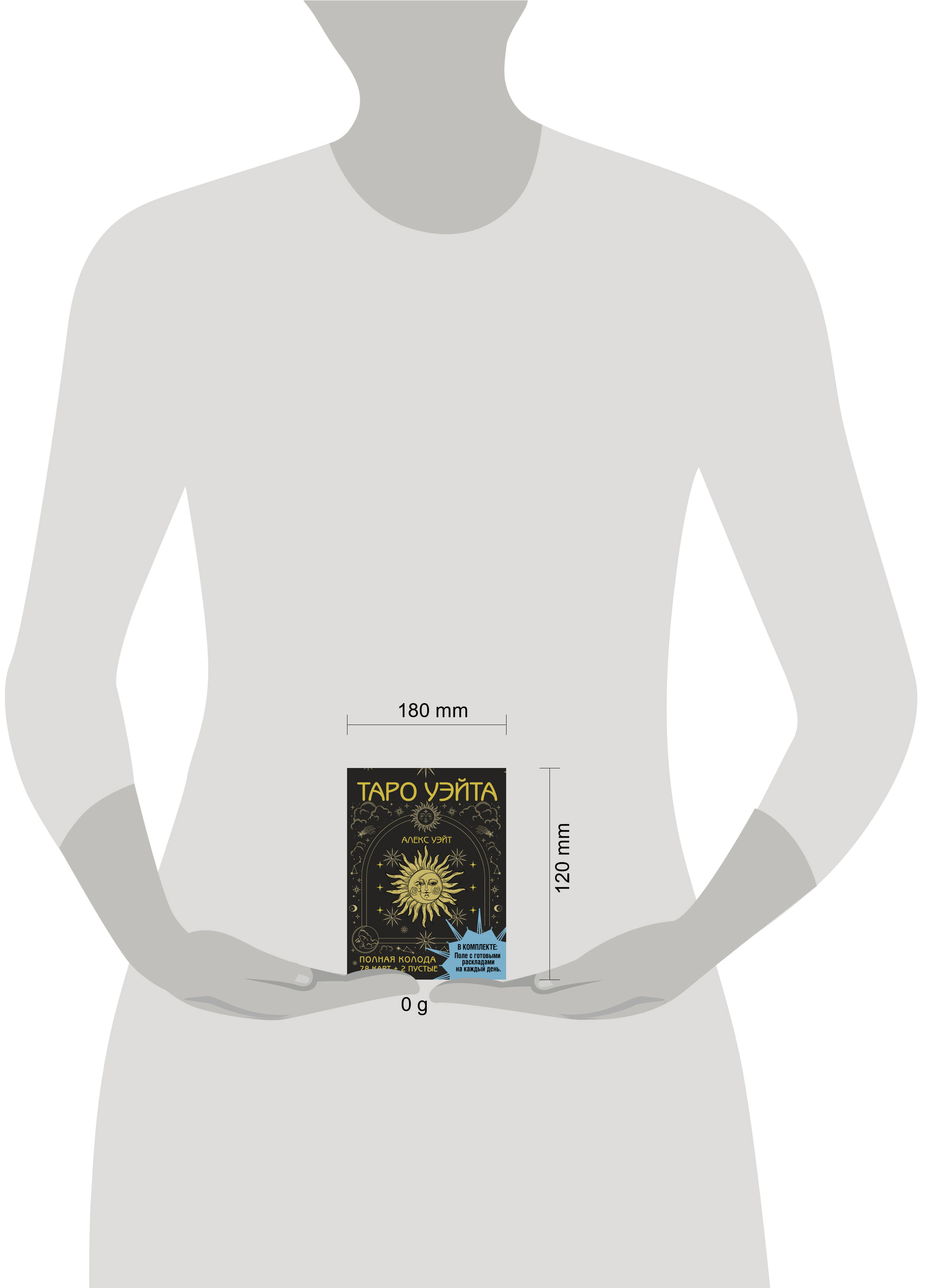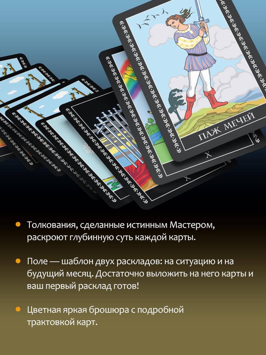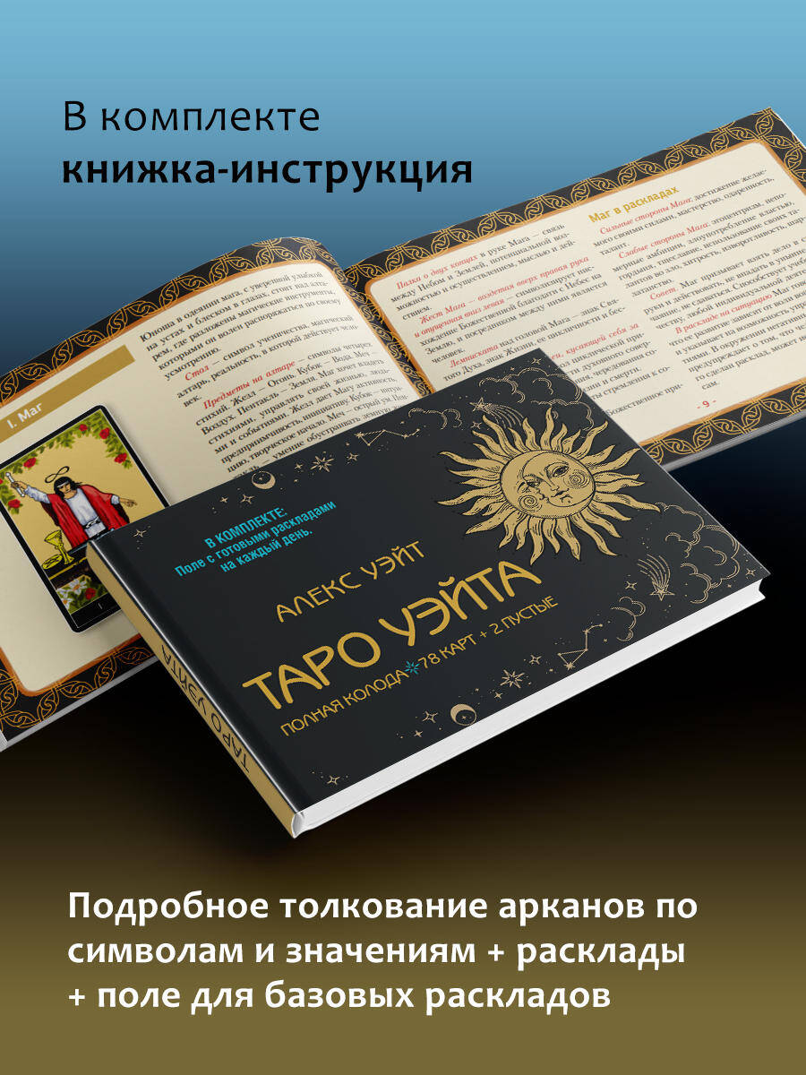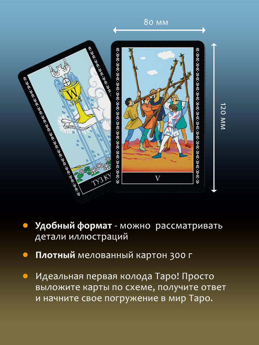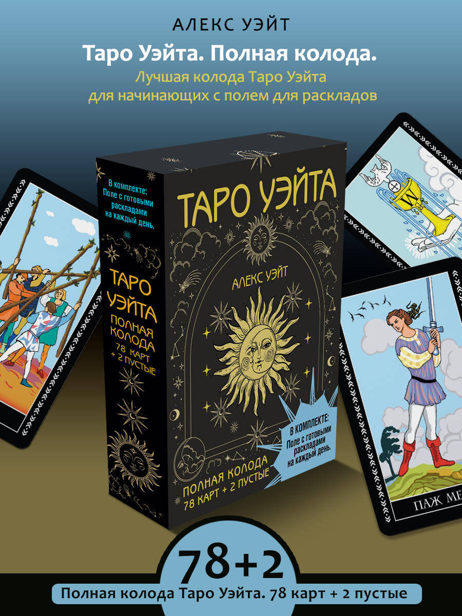 Перед вами полная колода Таро Уэйта: 78 карт + 2 пустые. В подарок к ней - полноцветное руководство с подробным описанием карт и поле для раскладов! Таро - древнейшая предсказательная система. С тех пор как она стала известна человечеству, значения карт обросли домыслами и фантазиями. Колода Уэйта - одна из немногих, донесших до нас суть первоначальной системы Таро. Однако и с этой колодой надо уметь работать, свои тайны она открывает не всем. Трактовка карт по стандартным значениям и онлайн-гадания - скорее развлечение, они не дают точных прогнозов. Чтобы научиться гадать по-настоящему, надо знать символику Таро. Толкования, сделанные истинным Мастером, раскроют глубинную суть каждой карты - то, что известно лишь самым опытным тарологам. С помощью книги, которая прилагается к колоде, даже новичок быстро научится понимать символику Таро, слышать, что говорят карты, и делать точные предсказания. Поле для раскладов поможет вам сразу же, без детального изучения, сделать первый настоящий расклад. Просто выложите карты на поле и получите ответ. Поле создано для двух раскладов - на ситуацию и на будущий месяц. Но после того, как вы научитесь общаться с картами, вы сможете делать расклады самостоятельно. Начните гадать прямо сейчас!