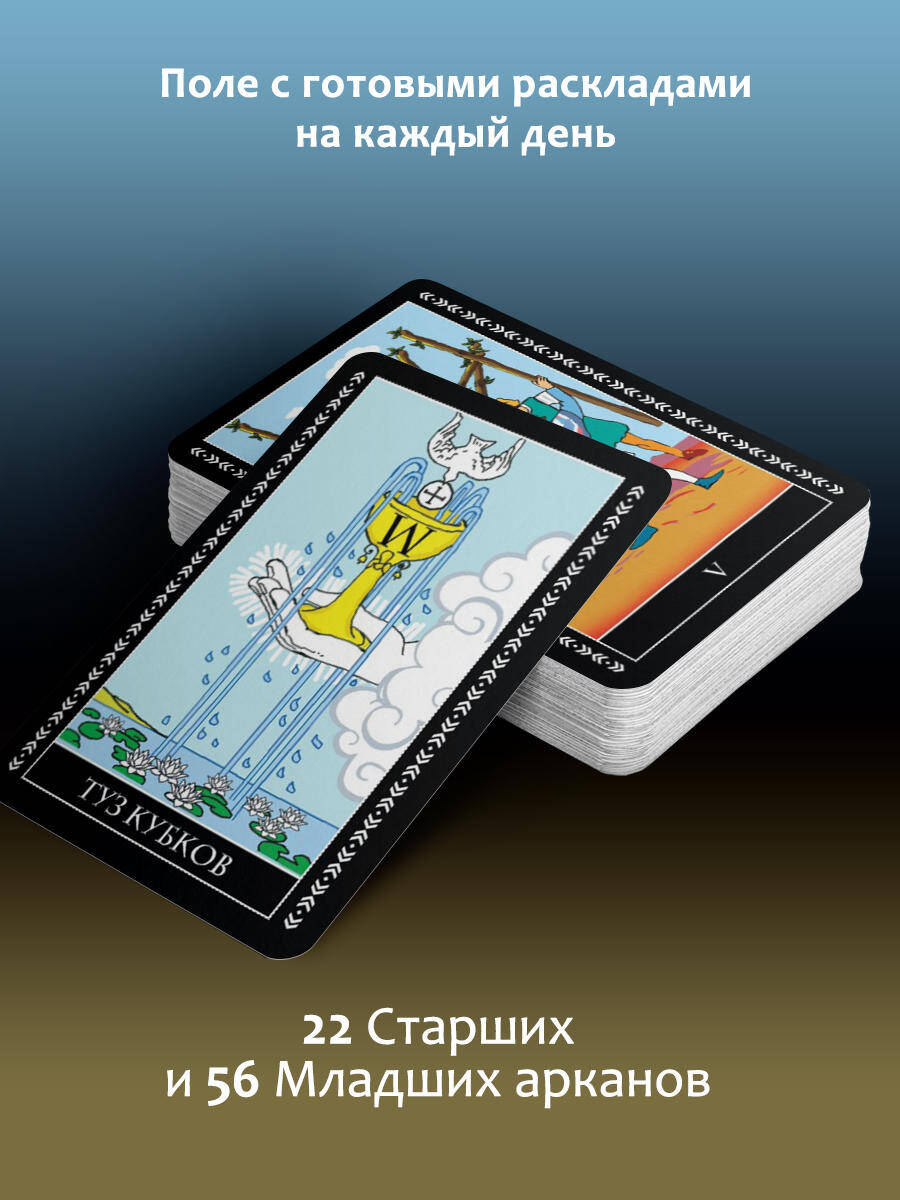 Аннотация: Таро Уэйта. Полная колода (78 карт + 2 пустые). В комплекте: Поле с готовыми раскладами на каждый день