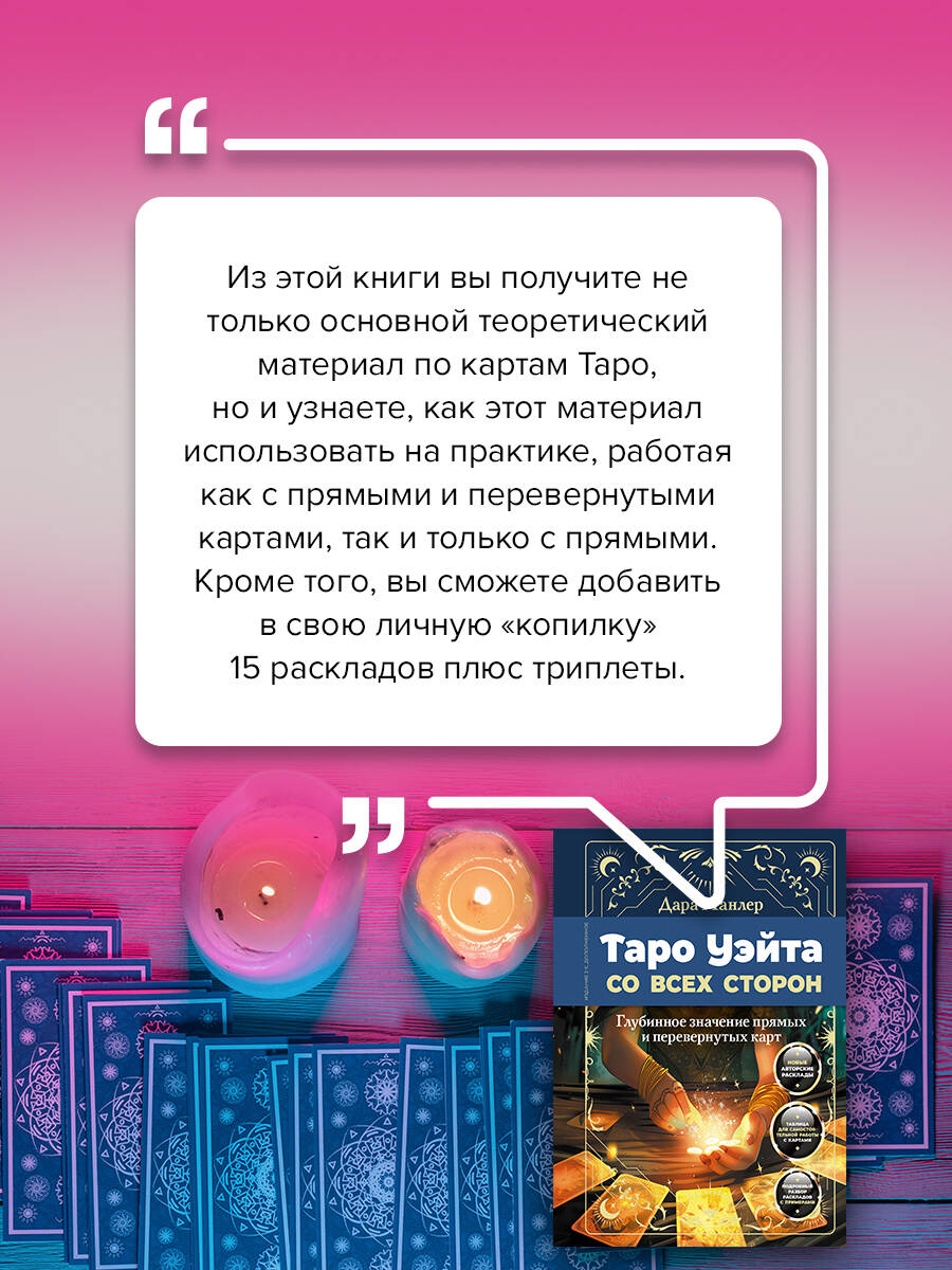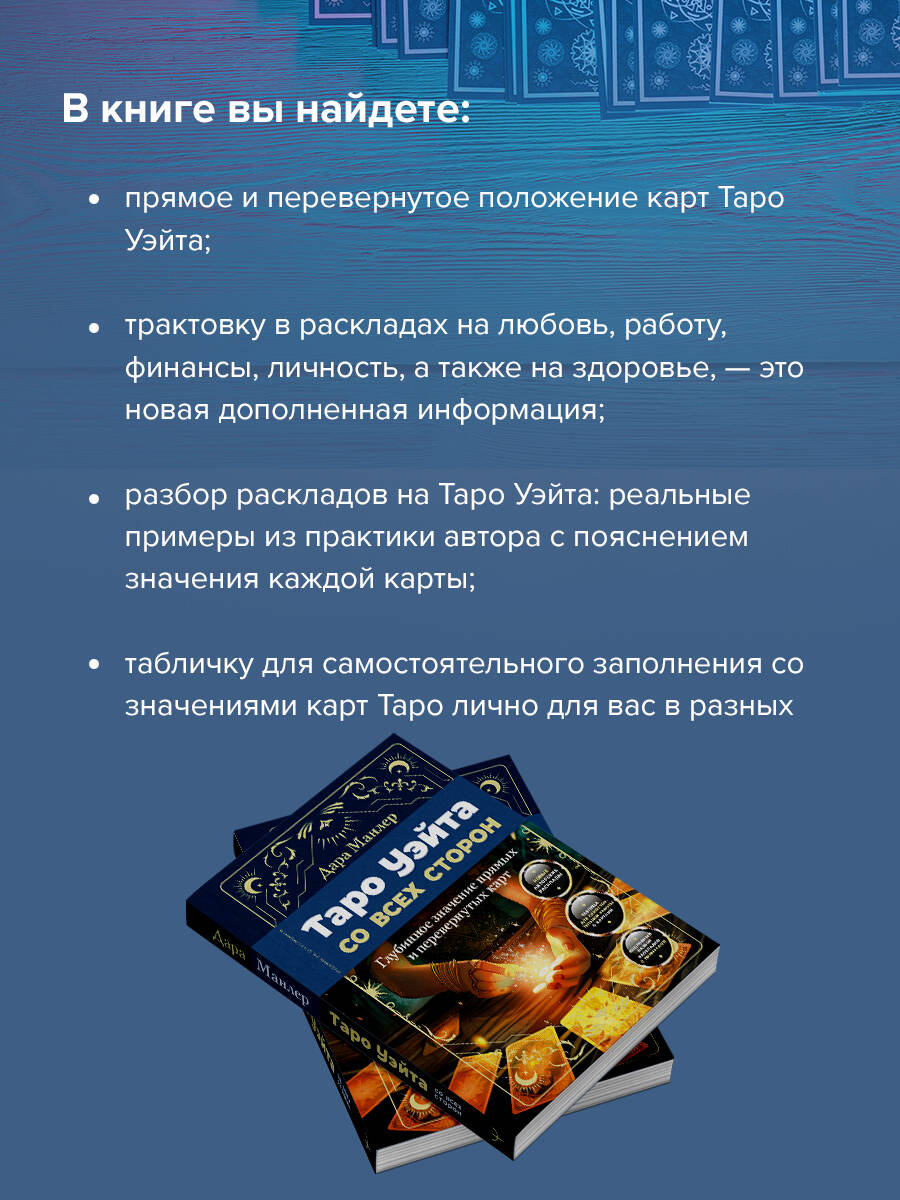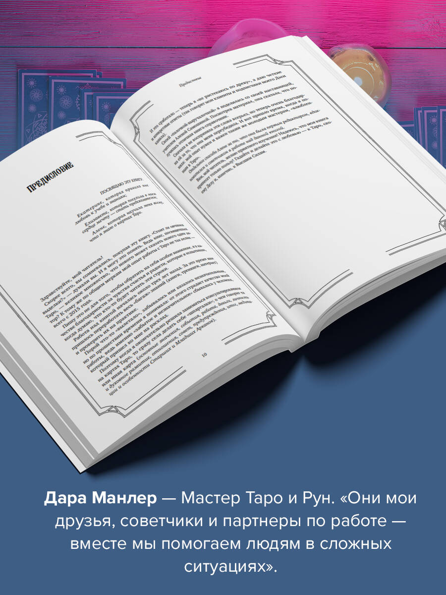 Дополненное, расширенное переиздание книги, которая уже зарекомендовала себя как отличное руководство по Таро. Книга сделана в формате справочника и показывает значения карт во всех положениях и раскладах на любые темы четко, без лишних слов. Вы узнаете, как понимать послания карт в контексте отношений, финансов, карьеры, личности. Книга включает уникальные авторские расклады и практические советы для тарологов любого уровня: от начинающих до опытных мастеров. По просьбам читателей автор дополнила книгу значениями карт по здоровью (в прямом положении), примерами раскладов и подробными разборами реальных ситуаций. В конце книги вы найдете таблицу для самостоятельного заполнения, чтобы выписать значения карт. Это не теоретическая информация, собранная из других источников, а результат многолетней практики, работы с клиентами и картами. Автор книги, Дара Манлер - мастер Таро и Рун. Вы имеете возможность ознакомиться с результатами ее многолетнего опыта работы с реальными людьми в реальных ситуациях. Как пишет сама Дара: "Я умею, но не люблю работать с такими картами. Они "переворачивают" энергию, отчего мне бывает не очень хорошо. Но если вы работаете по значениям карт, а не "в потоке", вам достаточно комфортно будет работать и с перевернутыми".