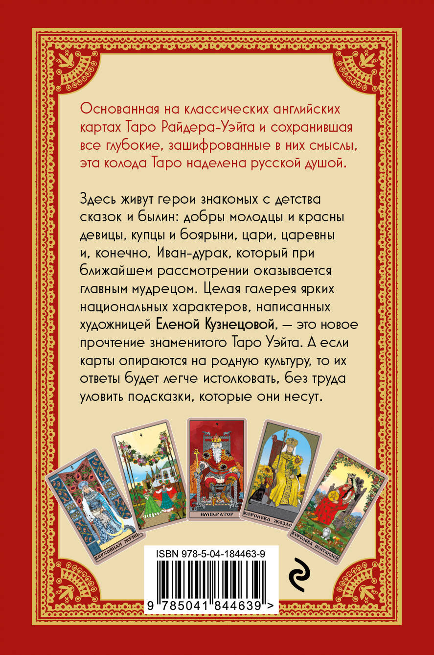 Основанная на классических картах таро Уэйта и сохранившая все глубокие, зашифрованные в них смыслы, эта колода таро наделена русской душой. Здесь живут герои знакомых с детства сказок и былин: добрые молодцы и красные девицы, купцы и боярыни, цари, царевны и, конечно, Иван-Дурак, который при ближайшем рассмотрении, оказывается главным мудрецом. Целая галерея ярких национальных характеров, написанных художницей Еленой Кузнецовой - это новое прочтение знаменитого Таро Уйэта. А если карты опираются на родную культуру, то их ответы будет легче истолковать, без труда уловить подсказки, которые они несут. Колода в изысканном подарочном оформлении для коллекционеров и всех любителей волшебного мира таро.| Издательство | ООО "Издательство "Эксмо" |