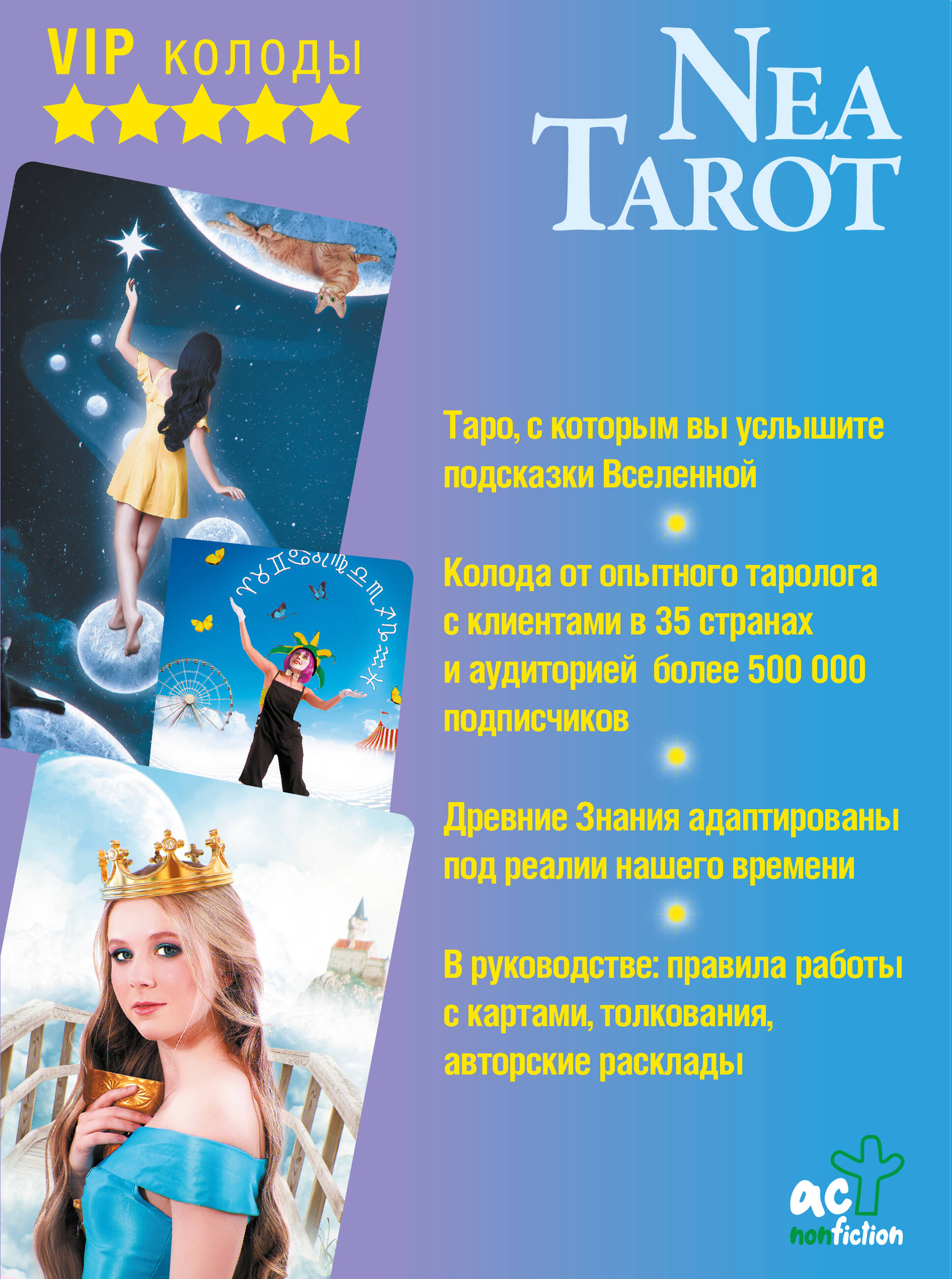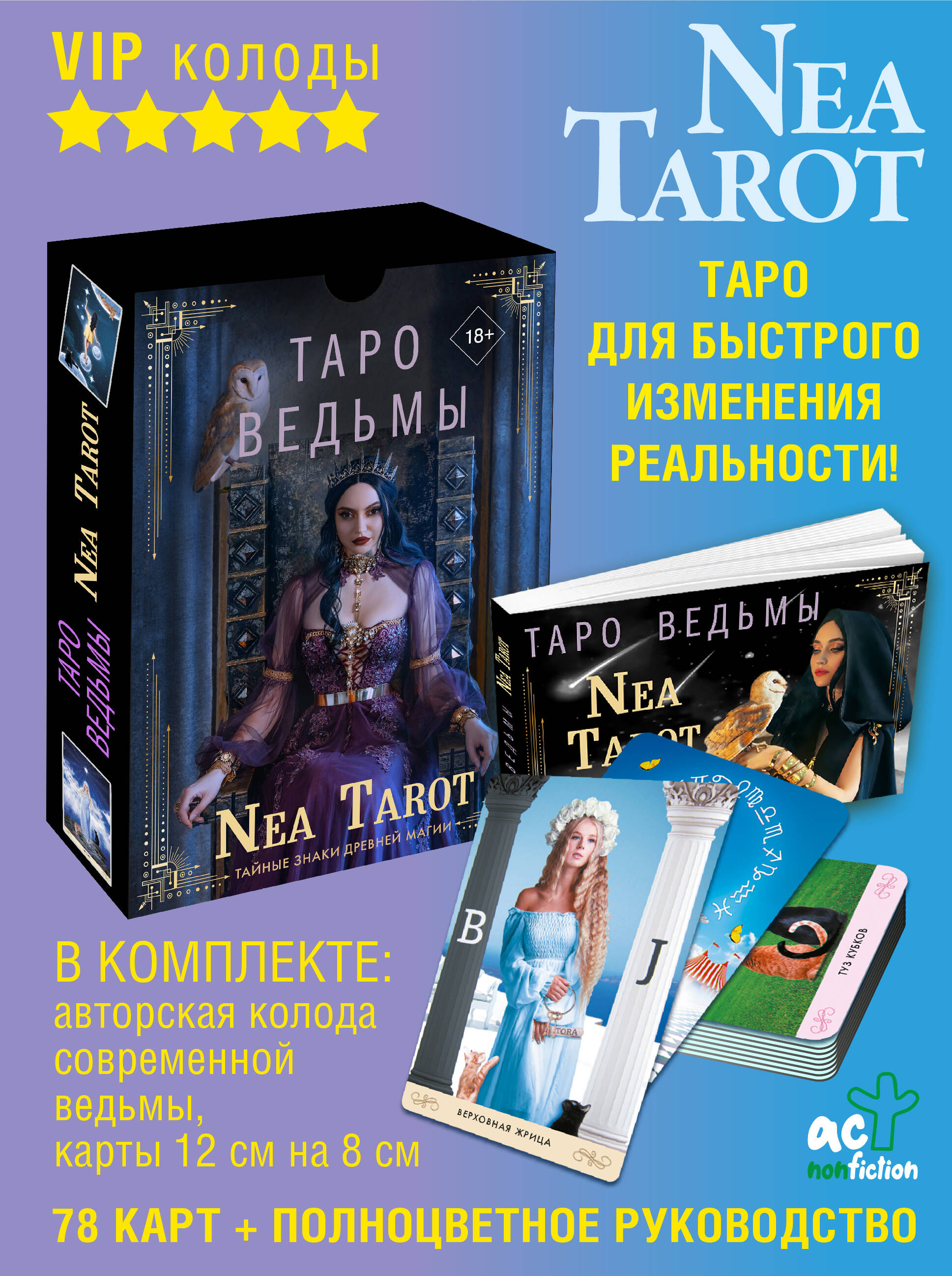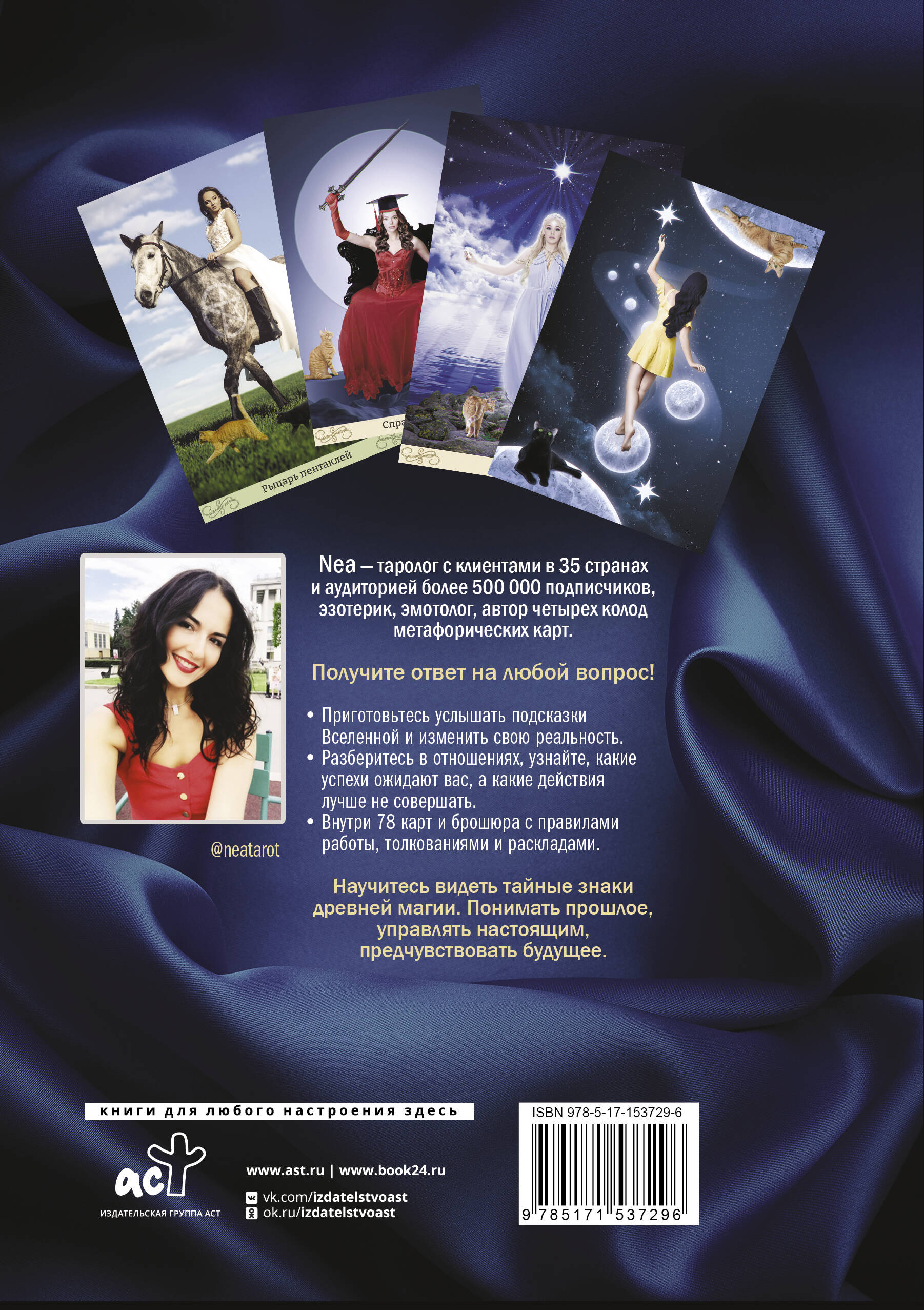 Nea - таролог с клиентами в 35 странах и аудиторией более 500 000 подписчиков, эзотерик, эмотолог, автор четырех колод метафорических карт. "Таро Ведьмы. Тайные знаки древней магии" - уникальное совмещение эзотерических знаний и психологических приемов. Это не просто колода Таро, способная предсказывать будущее, прорабатывать настоящее, но и позволяющая погрузиться в себя, войти в нужное состояние и получить ответы от Вселенной. Классическое Таро обретает новое прочтение, традиционные символы получают тайные смыслы и дополнительные значения, позволяющие еще глубже погрузиться в магию Таро. Карты наполнены яркими эмоциями и образами, благодаря чему с "Таро Ведьмы. Тайные знаки древней магии" легко найдут общий язык новички, а опытные тарологи смогут открыть для себя глубинные интерпретации привычных толкований. Вы получите ответы на вопросы в сфере любовных и личностных отношений, карьеры, здоровья. Сможете понять прошлое, управлять настоящим и предвидеть будущее. Получите ответ на любой вопрос! • Приготовьтесь услышать подсказки Вселенной и изменить свою реальность. • Разберитесь в отношениях, узнайте, какие успехи ожидают вас, а какие действия лучше не совершать. • Большая подарочная коробка: внутри 78 карт и брошюра с правилами работы, толкованиями и раскладами. Научитесь видеть тайные знаки древней магии. Понимать прошлое, управлять настоящим, предчувствовать будущее.| Издательство | ИЗДАТЕЛЬСТВО "АСТ" |