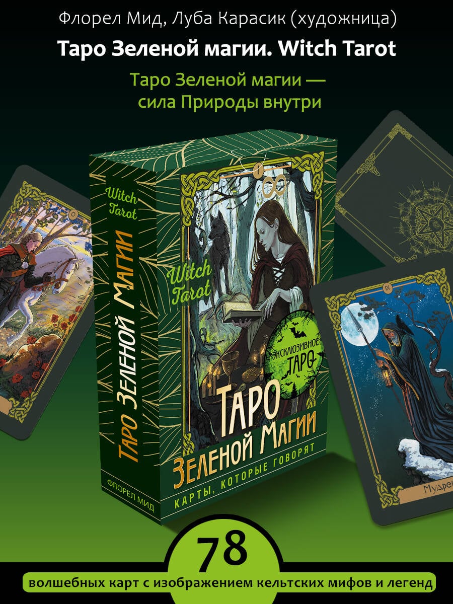"Таро Зеленой магии" - 78 мистических карт, которые помогут вам стать настоящей ведьмой или ведьмаком. Эта колода словно колдовское зелье, замешанное на энергиях кельтских богов и героев, растений и трав, которые вместе дают раскладам особую силу. "Таро Зеленой магии" создано на основе классической колоды Уэйта, но имеет уникальную энергетику, раскрывающуюся в образах карт. Персонажи, изображенные на Арканах, отсылают к кельтской (и частично скандинавской) мифологии, к их архетипам героев и богов. А растительные символы на каждой карте подсказывают, откуда можно черпать дополнительную силу в момент расклада. В этой колоде настоящее, прошлое и будущее переплетаются между собой, напоминая нам о том, что времени не существует. Здесь вас встретят танцующие пикси, играющий на дудочке лепрекон и сам великий друид Мерлин, вещающий сквозь века, чтобы ответить на ваши вопросы. Каждому Младшему Аркану соответствует то или иное растение, а в руководстве прописано его использование в магических целях. Из него вы узнаете, почему Туз Мечей обвит плетистой розой, Тройка Пентаклей утопает в сирени, а Паж Кубков так очарован колокольчиком. И как каждое из этих растений можно использовать в зеленом ведовстве. Соприкоснитесь с мощной аурой магических символов, смыслов, с энергетикой магических трав, цветов и деревьев. Разложите карты, и вы легко поймете, что они хотят вам сказать, даже если это ваша первая колода Таро. В колоде 78 карт и подробное руководство. Карты и брошюра упакованы в большую подарочную коробку.