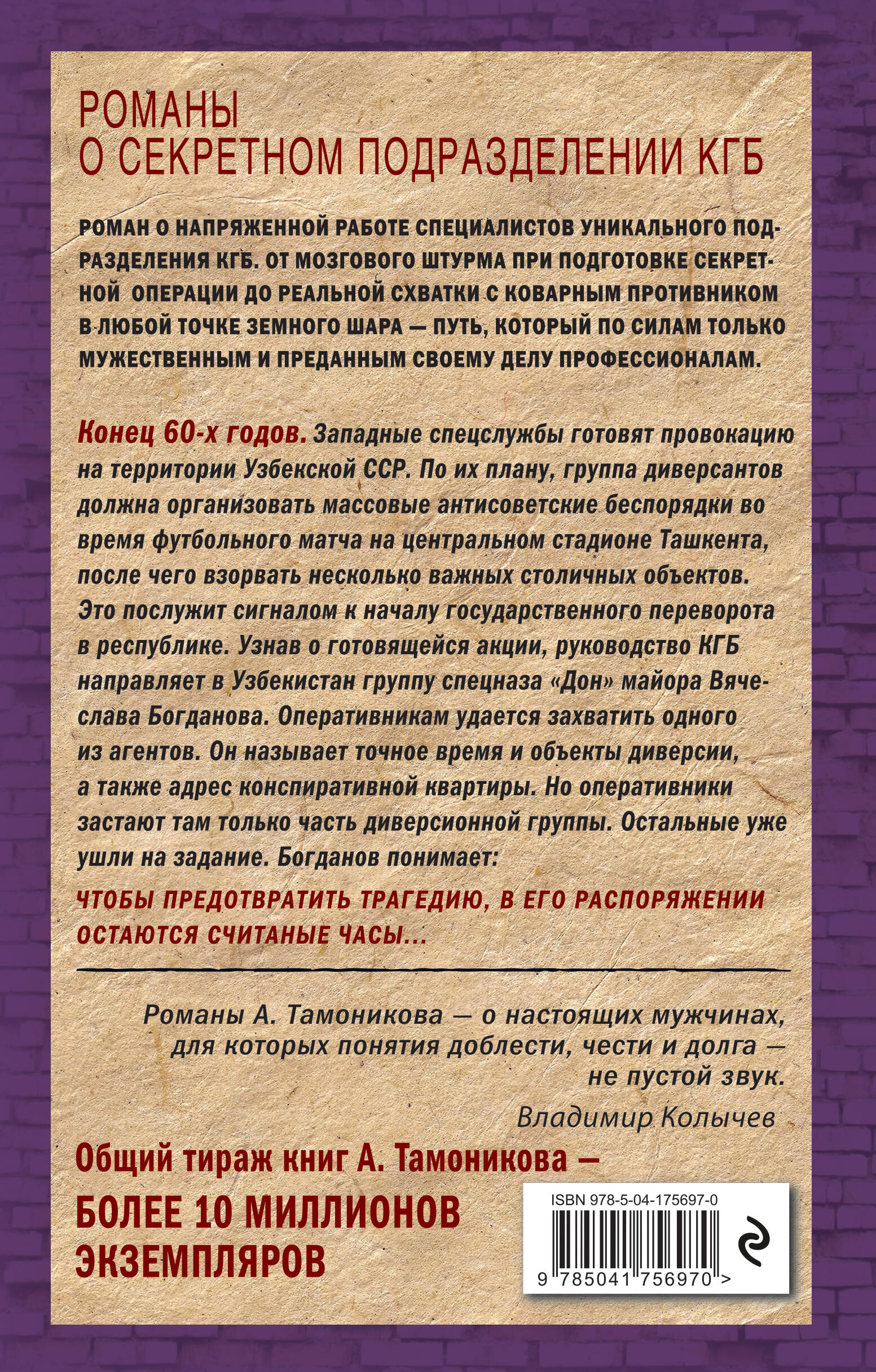 Роман о напряженной работе специалистов уникального подразделения КГБ. От мозгового штурма при подготовке секретной операции до реальной схватки с коварным противником в любой точке земного шара - путь, который по силам только мужественным и преданным своему делу профессионалам. Конец 60-х годов. Западные спецслужбы готовят провокацию на территории Узбекской ССР. По их плану, группа диверсантов должна организовать массовые антисоветские беспорядки во время футбольного матча на центральном стадионе Ташкента, после чего взорвать несколько важных столичных объектов. Это послужит сигналом к началу государственного переворота в республике. Узнав о готовящейся акции, руководство КГБ направляет в Узбекистан группу спецназа «Дон» майора Вячеслава Богданова. Оперативникам удается захватить одного из агентов. Он называет точное время и объекты диверсии, а также адрес конспиративной квартиры. Но оперативники застают там только часть диверсионной группы. Остальные уже ушли на задание. Богданов понимает: чтобы предотвратить трагедию, в его распоряжении остаются считанные часы… «Романы А. Тамоникова - о настоящих мужчинах, для которых понятия доблести, чести и долга - не пустой звук». - В. Колычев Общий тираж книг А. Тамоникова - более 10 миллионов экземпляров.| Издательство | ООО "Издательство "Эксмо" |
