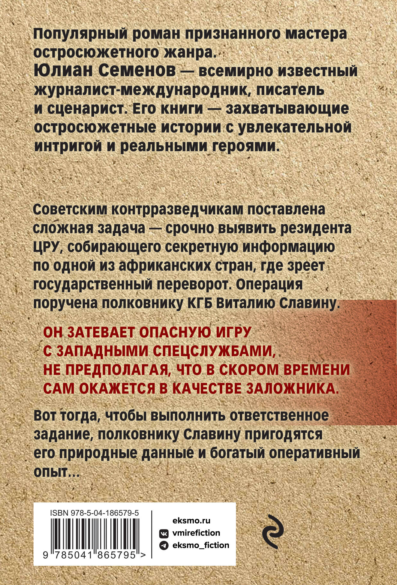 Популярный роман признанного мастера политического детектива. Юлиан Семенов - всемирно известный журналист-международник, писатель и сценарист. Его книги - захватывающие остросюжетные истории с увлекательной интригой и реальными героями. Советским контрразведчикам поставлена сложная задача - срочно выявить резидента ЦРУ, собирающего секретную информацию по одной из африканских стран, где зреет государственный переворот. Операция поручена полковнику КГБ Виталию Славину. Он затевает опасную игру с западными спецслужбами, не предполагая, что в скором времени сам окажется в качестве заложника. Вот тогда, чтобы выполнить ответственное задание, полковнику Славину пригодятся его природные данные и богатый оперативный опыт…