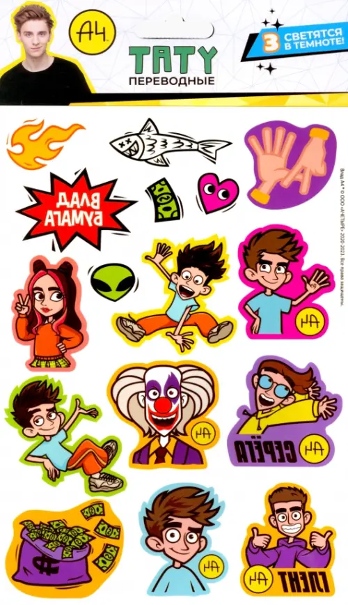Уникальная новинка к лету - набор переводных татуировок от самого крутого блоггера Влада А4. Яркие персонажи, крутые иконки + три тату светятся в темноте. Сделай лето ярче.