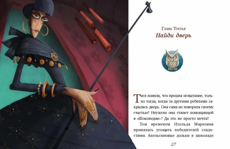 Волшебный магазин "Шоковедия" ищет маленьких помощников! Такое объявление появилось в одном из самых загадочных магазинов сладостей города. Каждый день его витрина менялась: то это волшебный лес с марципановыми деревьями и шоколадными белочками, то озеро из синей глазури и шоколадными лебедями. А уж как вкусно пахнет шоколадом… Рыжеволосая девочка Тася становится одной из помощниц хозяйки магазина Изольды Марковны, женщины с чёрными, как горький шоколад, глазами. В подвале, за маленькой дверкой, Тася находит коробочку с пастильными феями Розой и Беллой. Тут и начинается самое интересное. Кто же такая Шоколдунья на самом деле?Книгу проиллюстрировал замечательный художник Никита Орлов. Для младшего школьного возраста.
