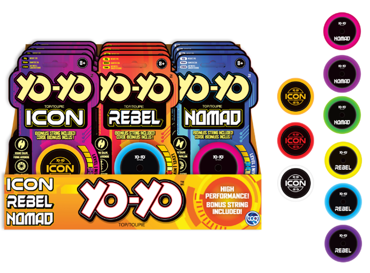 YO-PRO ICON, REBEL и NOMAD - это современные, высокоэффективные версии классической игрушки из детства. Они предлагают множество функций, которые подходят разным характерам и уровням мастерства игроков. Йо-йо выполняет все трюки, оснащено автоматическим возвратом с помощью четырёх подшипников, который возвращает йо-йо в руку из спящего положения. Игрушка лёгкая, выполнена из пластика и очень прочная.